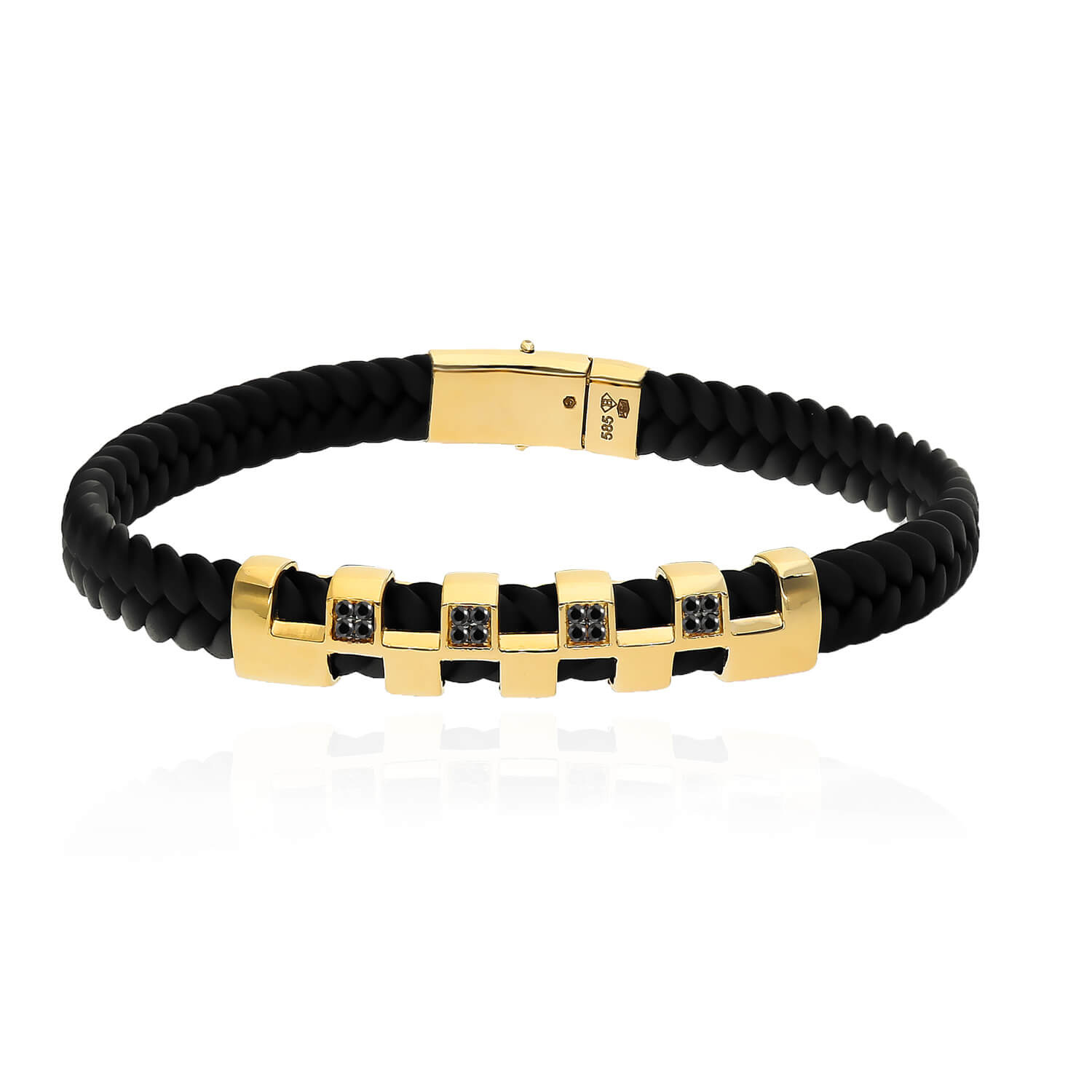 Armbänder gebrauch: Für elegante und selbstbewusste Männer. Hergestellt in 585 Gold (14 Karat) kombiniert mit einem Lederbändchen. Verziert mit sechs schwarzen Zirkonias. Am Handgelenk getragen, begleitet von einer Markenuhr, unterstreicht sie perfekt den hohen Status des Trägers. Sein starkes Funkeln wird Ihnen helfen, so manchen Kunden bei einem Geschäftsessen zu überzeugen. Ein Armband, das einem Partner geschenkt wird, erhält einen zusätzlichen Wert, wenn wir eine persönliche Widmung eingravieren. 585 Gold Herrenarmband mit Gravur wird ein einzigartiges Andenken für die nächsten Jahre sein.