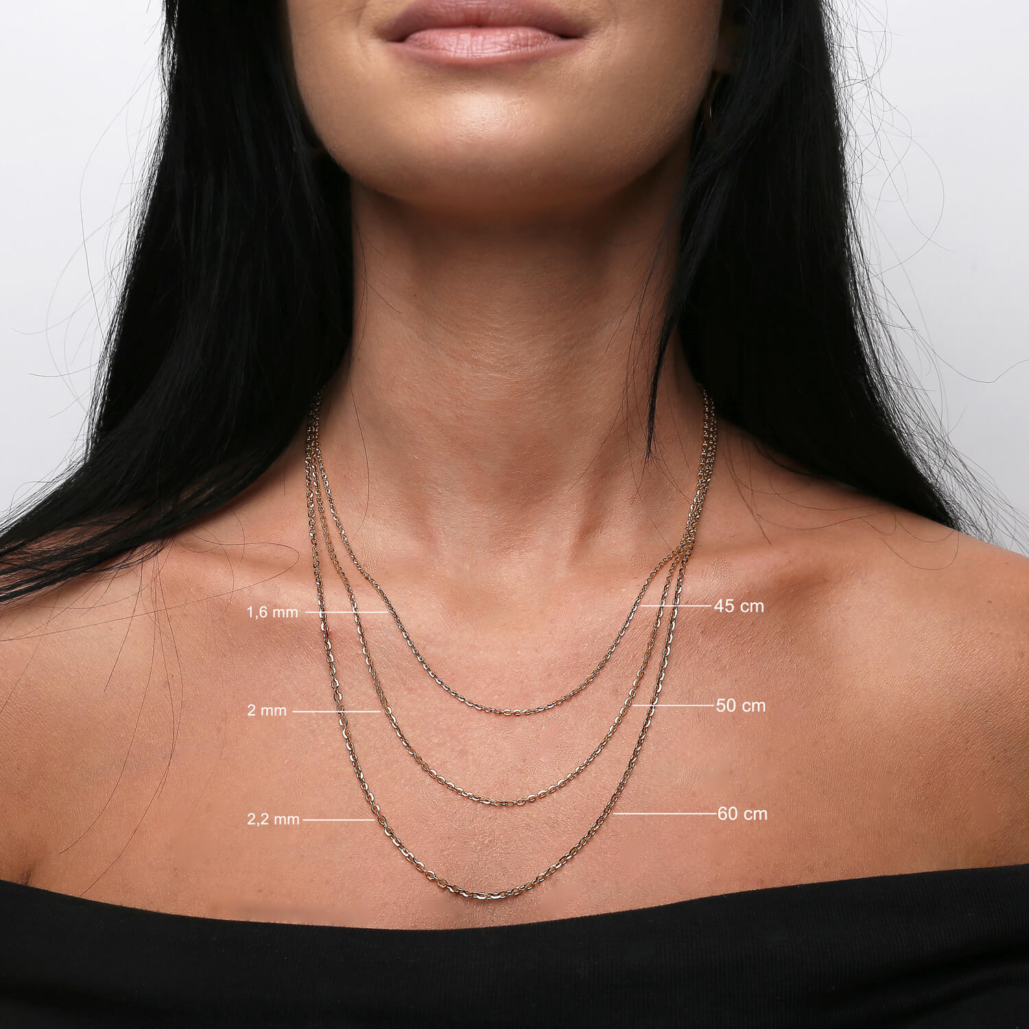 Präzision in Handarbeitvollständig kette mit goldprobe - 585 (8 Karat). Das Preis-Leistungs-Verhältnis ist sehr gut. Die Echtheit des Produkts wird von bestätigt juwelier-Etikett und die auf die Kette gestempelten Merkmale nach Prüfung durchPolnisches Prüfungsamt. Die als Fußkettchen bezeichnete Webart ist die am häufigsten verwendete Kette bei Halsketten für Prominente. Die Art und Weise, wie die Glieder miteinander verbunden sind, schützt die Kette vor ungewollten Brüchen. Es wurde ein robuster und leicht zu tragender Kettenverschluss in Form eines Karabinerhakens verwendet. Das angebotene Modell ist eine zarte Variante des Fußkettchengeflechts mit einer Breite von etwa 1 mm. Eine goldene Fußkettchenkette schafft ideale Kombination mit einem eleganten Goldanhänger oder einer heiligen Medaille.