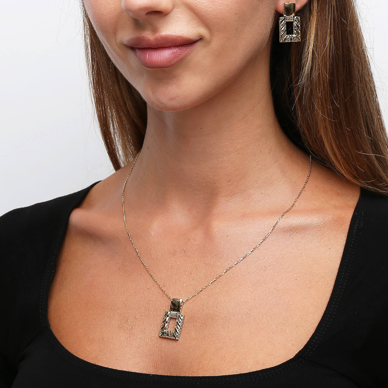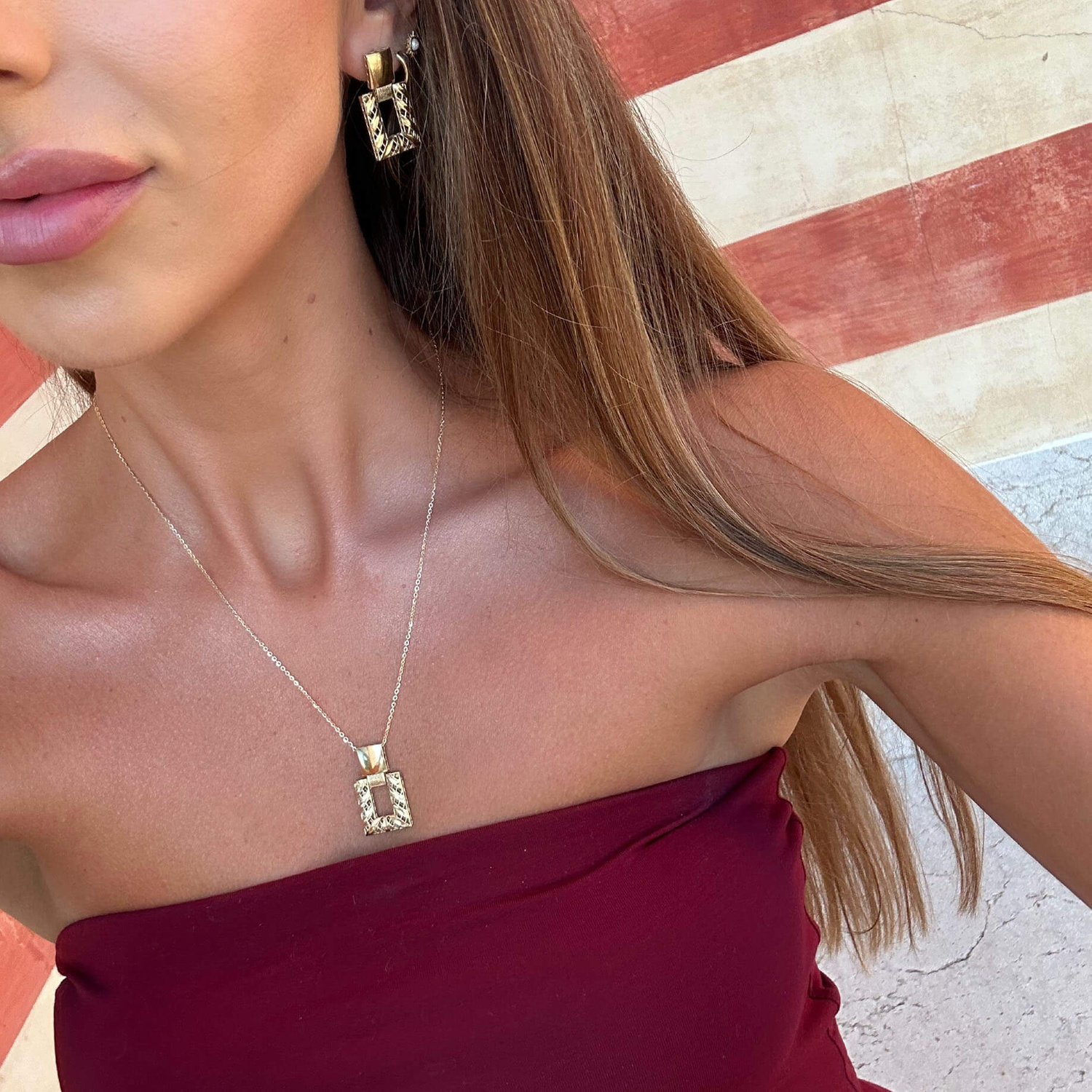 • Eine einzigartige Goldkette mit einem eleganten rechteckigen durchbrochenen Anhänger. Hergestellt aus 14 Karat Gelbgold (Muster 585). Sieht toll aus mit einem offenen Ausschnitt.