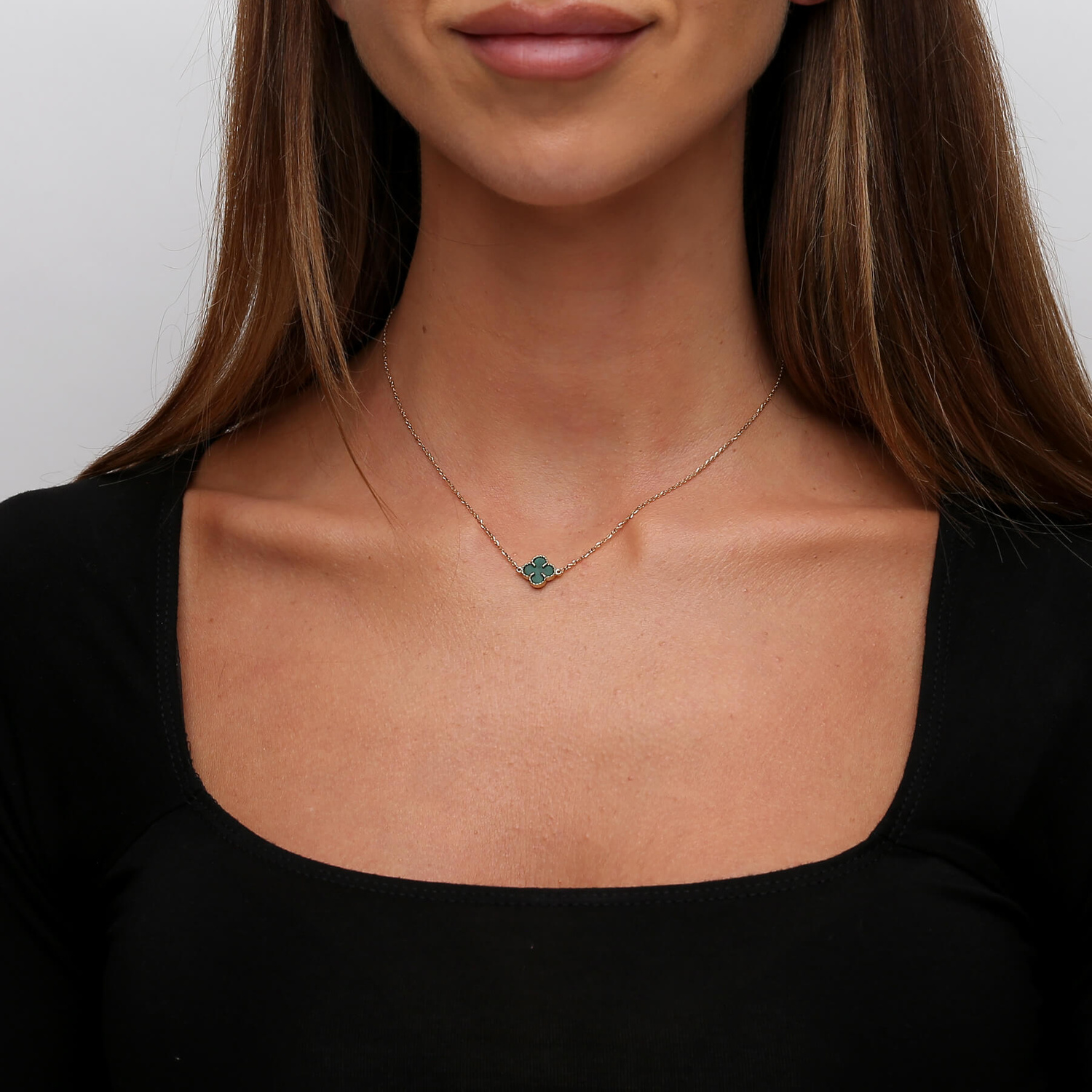 Zarte Halskette mit kleeblattförmigem Anhänger mit einem grünen Stein - natürlicher Malachit. Diamant-Fußkette. Hergestellt aus hochwertigem 585er Gold (14 Karat). Eine subtile Ergänzung für viele Looks. Wunderschön am Hals präsentiert.