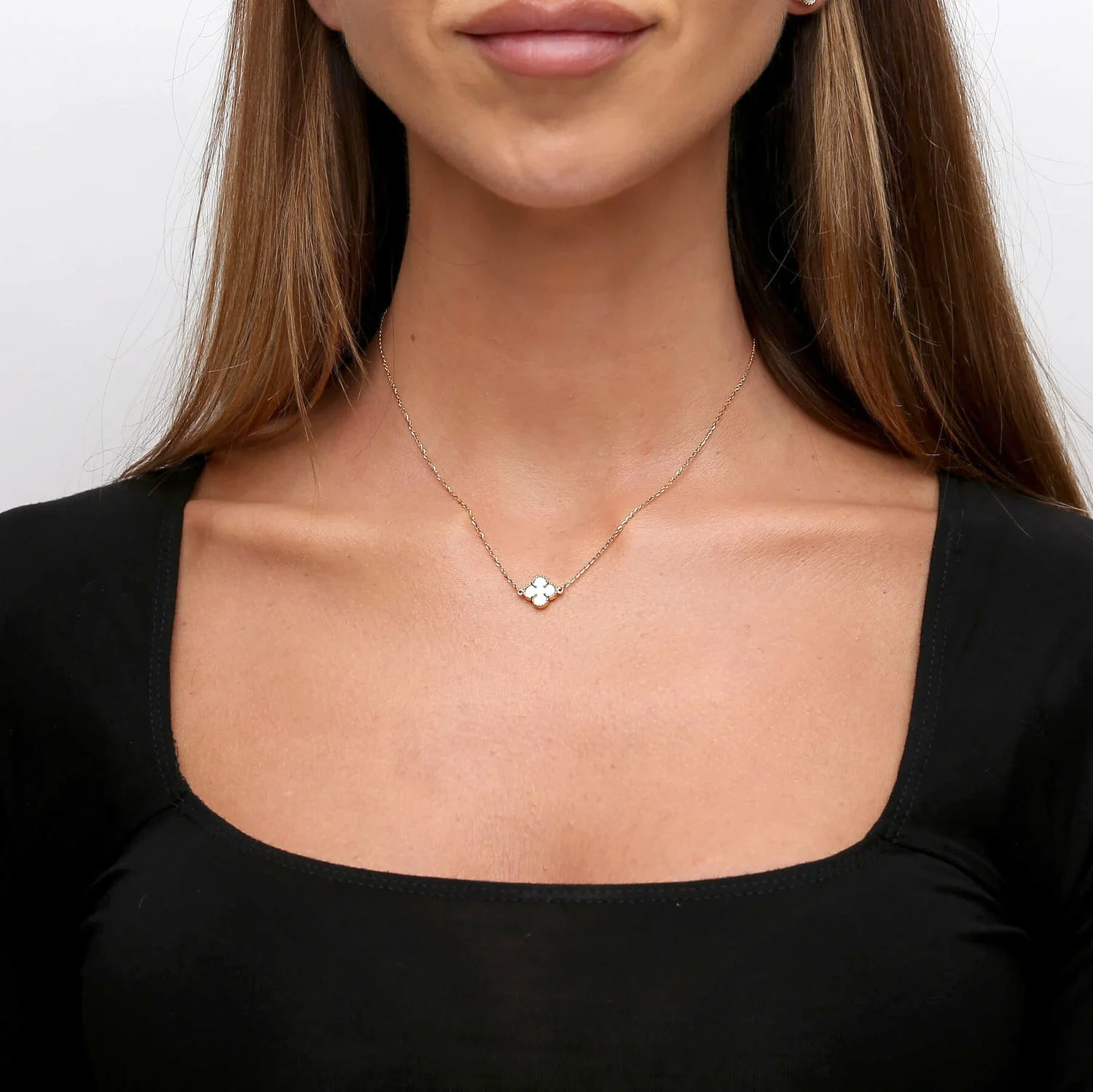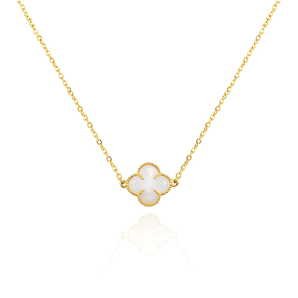 Zarte Halskette mit kleeblattförmigem Anhänger mit weißem Stein - perlmutt. Diamant-Fußkette. Hergestellt aus hochwertigem 585er Gold (14 Karat). Eine subtile Ergänzung für viele Looks. Wunderschön am Hals präsentiert.