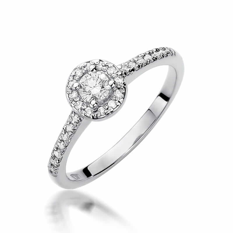 - Verlobungsring aus Gold mit mittig gefasstem Diamanten von 0,30 ct. Zusätzlich umgeben von 26 kleineren Diamanten mit einem Gesamtgewicht von 0,22 ct. Hergestellt aus hochreinem 585er Gold feinster Qualität.