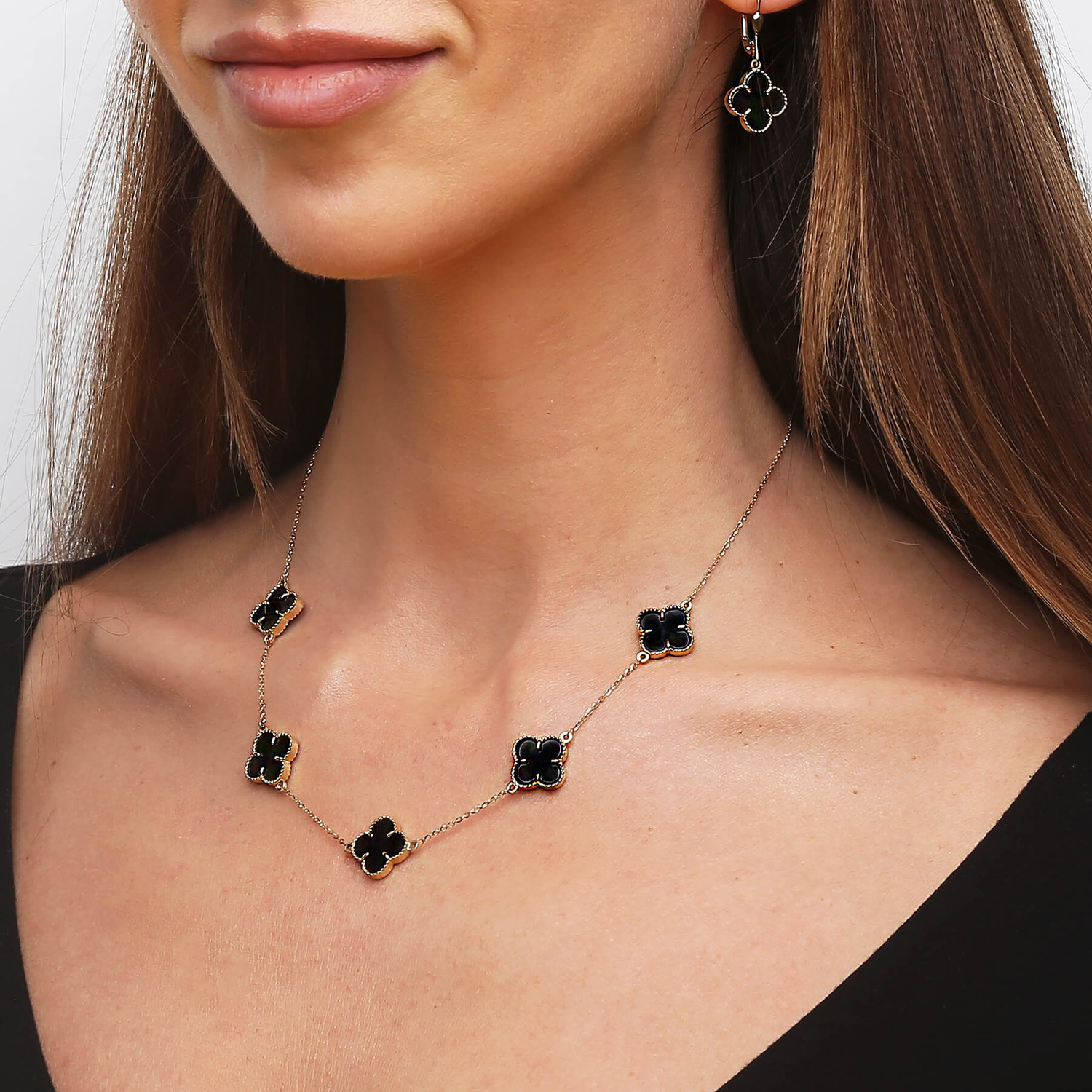 Charmante Ohrringe aus 585er (14 Karat) Gelbgold mit Onyx in Form von Kleeblättern. Der englische Verschluss ermöglicht ein einfaches An- und Ablegen. Die Ohrringe werden als Set mit einer Halskette und einem Armband geliefert.