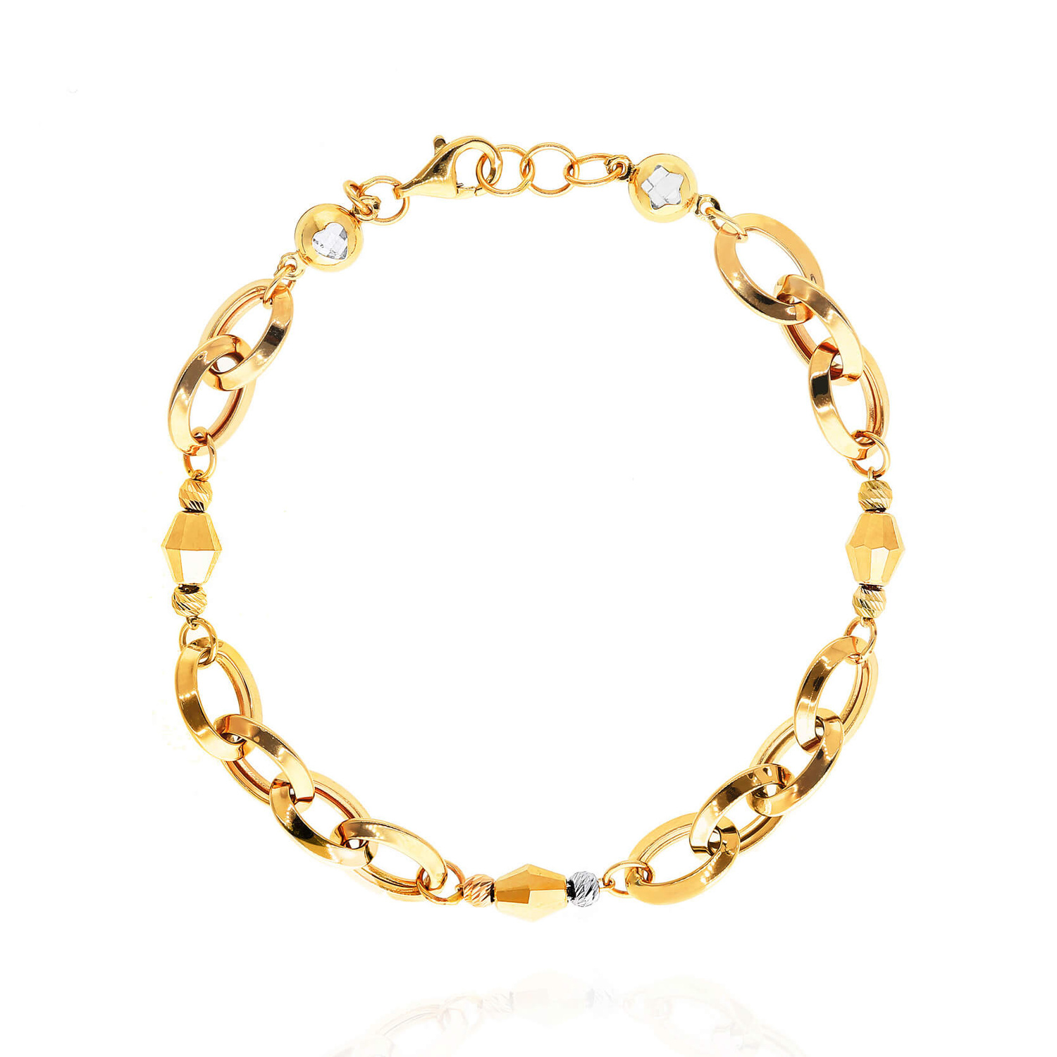 Massives Goldarmband, bestehend aus miteinander verbundenen Gliedern und facettierten Kugeln aus 585er Weiß- und Gelbgold (14 Karat). Die eleganten Glieder, die sorgfältig miteinander verbunden sind, bilden eine solide und effektvolle Struktur, während die facettierten Elemente das Licht reflektieren und dem Armband einen subtilen Glanz verleihen. Die Kombination der beiden Goldtöne – warmes, klassisches Gelbgold und elegantes Weißgold – verleiht dem Armband einen einzigartigen Charakter und schafft eine wunderschöne Komposition. Dank seiner massiven Form ist das Armband ein ausdrucksstarkes Schmuckstück, das sicherlich Aufmerksamkeit erregt und jedem Outfit Eleganz verleiht. Eine ausgezeichnete Wahl sowohl für den Alltag als auch für elegantere Anlässe.