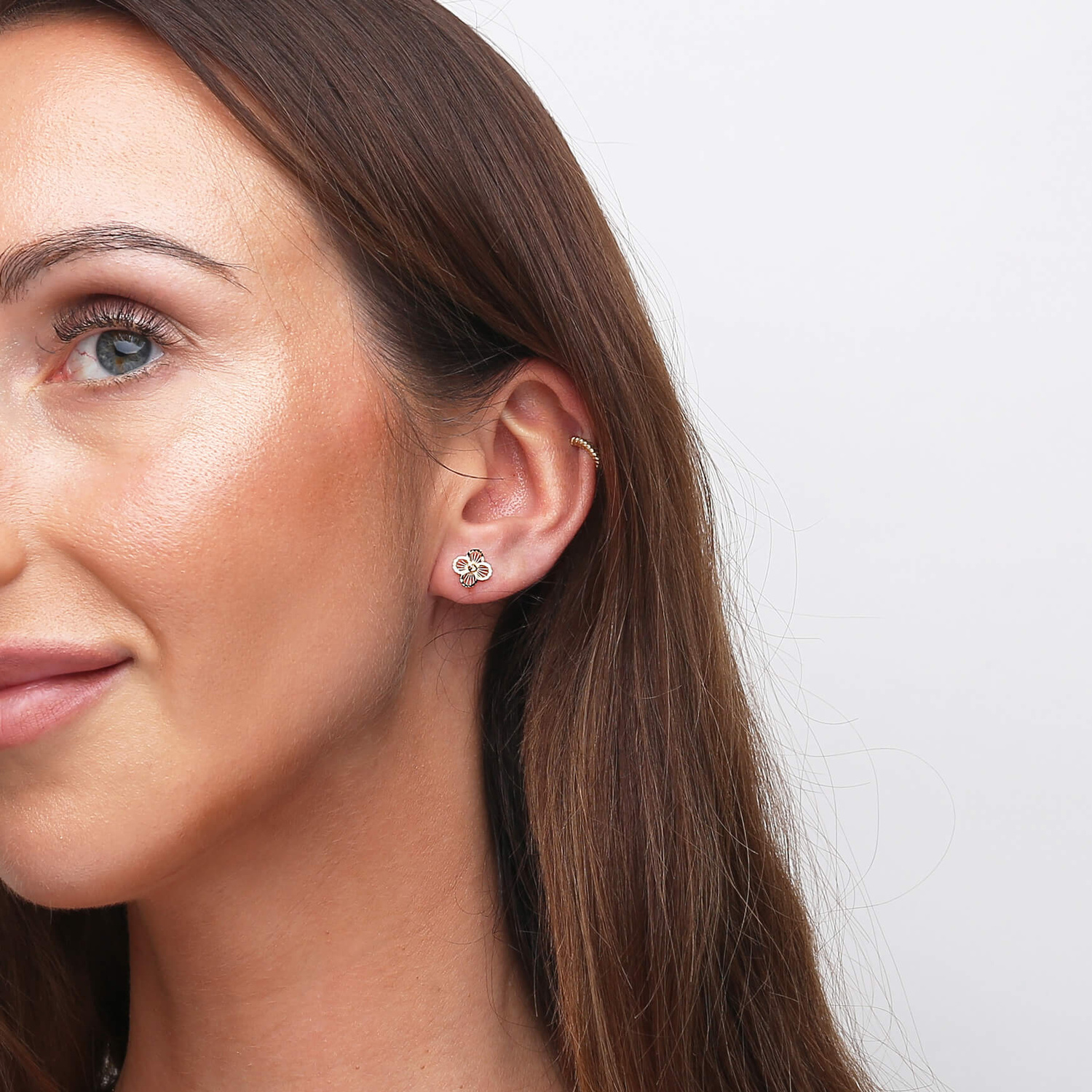 Die goldenen Ohrringe in Form eines durchbrochenen vierblättrigen Kleeblatts sind aus 585er Gelbgold (14 Karat) gefertigt, das äußerst widerstandsfähig gegen äußere Einflüsse ist. Die minimalistischen Ohrringe eignen sich ideal für den Alltag. Sie verfügen über einen bequemen Steckverschluss. Diese subtilen Ohrringe in Form von Kleeblättern sind ein elegantes Angebot für Liebhaber von charmantem und zartem Schmuck. Die Ohrringe haben ein durchbrochenes Blumenmuster, das ihnen Leichtigkeit und Finesse verleiht. Dank ihrer präzise facettierten Oberfläche reflektieren die Ohrringe das Licht auf bezaubernde Weise und erzeugen einen schimmernden Effekt. Sie passen hervorragend zu verschiedenen Outfits – von lässig bis elegant.