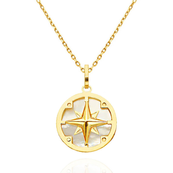 Der elegante Anhänger aus hochwertigem 585er Gelbgold (14 Karat) besticht durch seinen einzigartigen Stil, der Klassik und Moderne verbindet. Im Mittelpunkt des Schmuckstücks steht ein auffälliges Kompassmotiv – Symbol für Richtung, Kraft und Unabhängigkeit – vor einem Hintergrund aus Perlmutt. Die sorgfältig polierte Oberfläche des Goldes bildet einen schönen Kontrast zum Perlmutt und schafft eine anmutige Komposition. Der Anhänger kann täglich als persönlicher Talisman oder als auffälliges Accessoire zu Abendgarderobe getragen werden. Er passt perfekt zu einer Kette mit Anker-, Panzer- oder Figaro-Glieder.