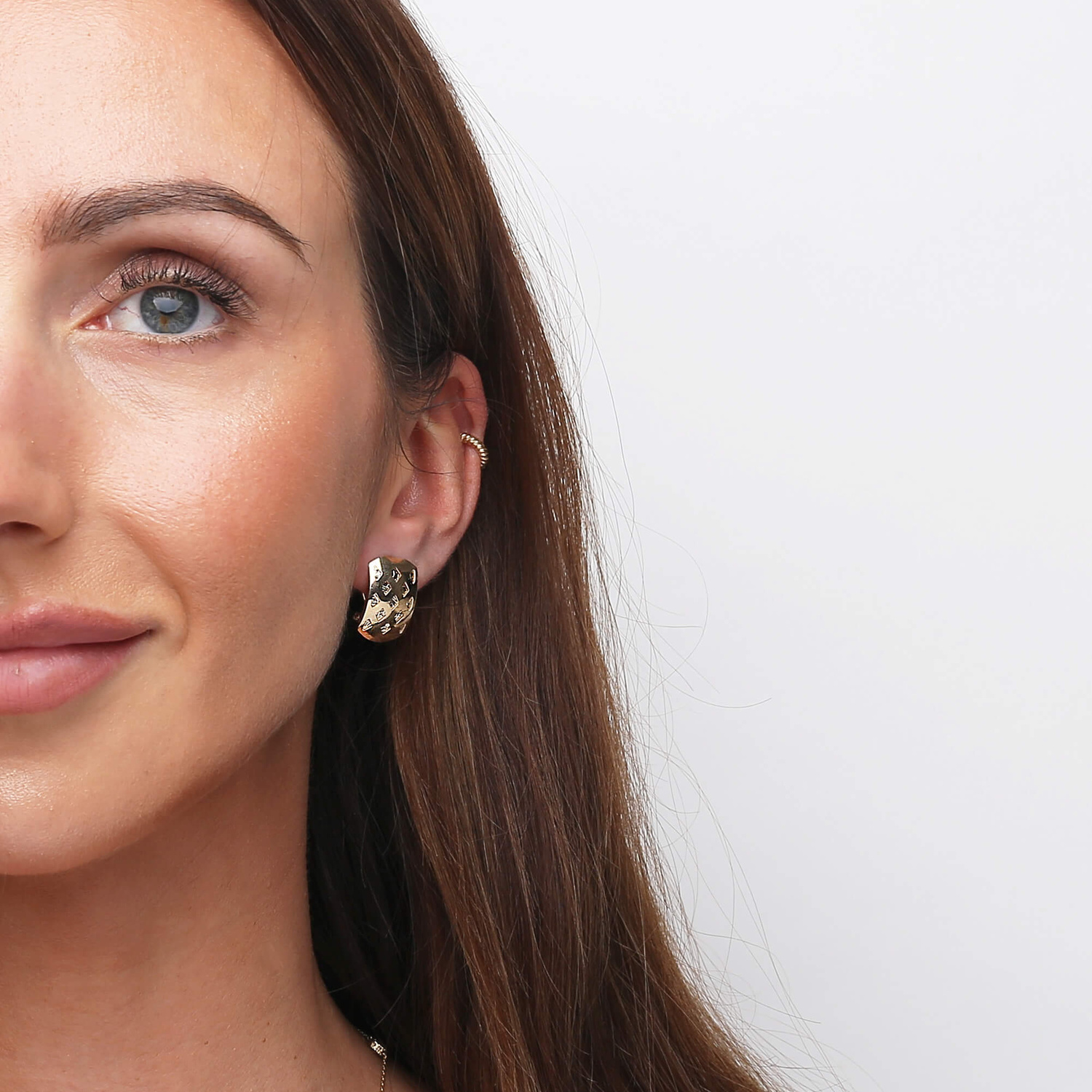 Goldene Ohrringe mit Diamanten, gefertigt aus hochwertigem Weiß- und Gelbgold mit einer Feinheit von 585 (14 Karat), mit einer einzigartigen Form und einem dezenten Glanz, sind die perfekte Wahl für Frauen, die klassische Eleganz in moderner Ausführung schätzen. Ihre leicht abgerundete Form passt sich perfekt dem Ohr an, und der Omega-Clipverschluss sorgt für Komfort und Sicherheit beim Tragen den ganzen Tag über. Dieser Schmuck eignet sich sowohl für den Alltag als auch für besondere Anlässe und verleiht jedem Outfit einen Hauch von Luxus.
