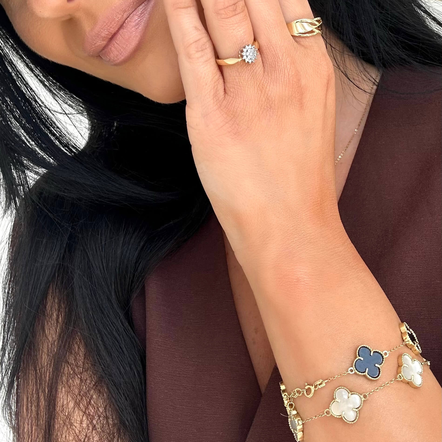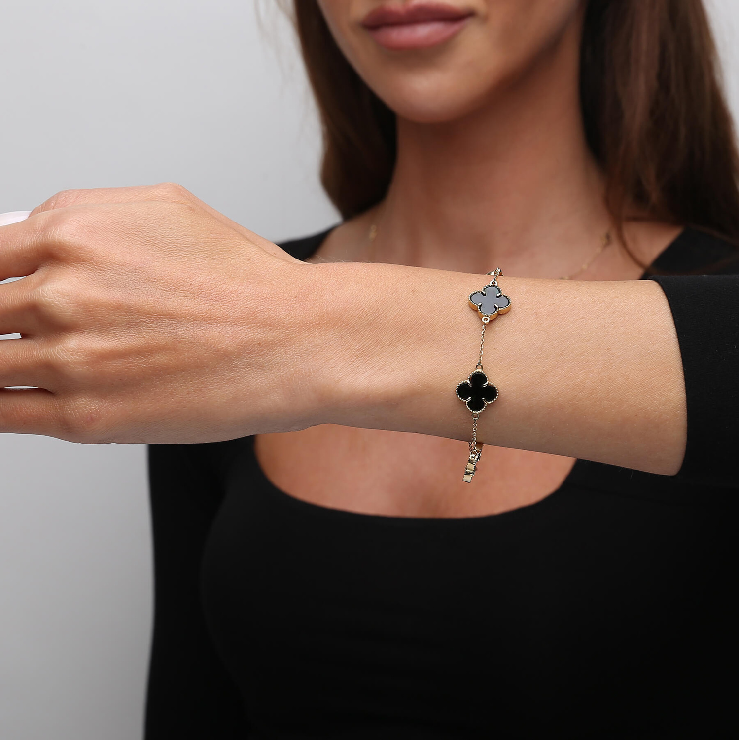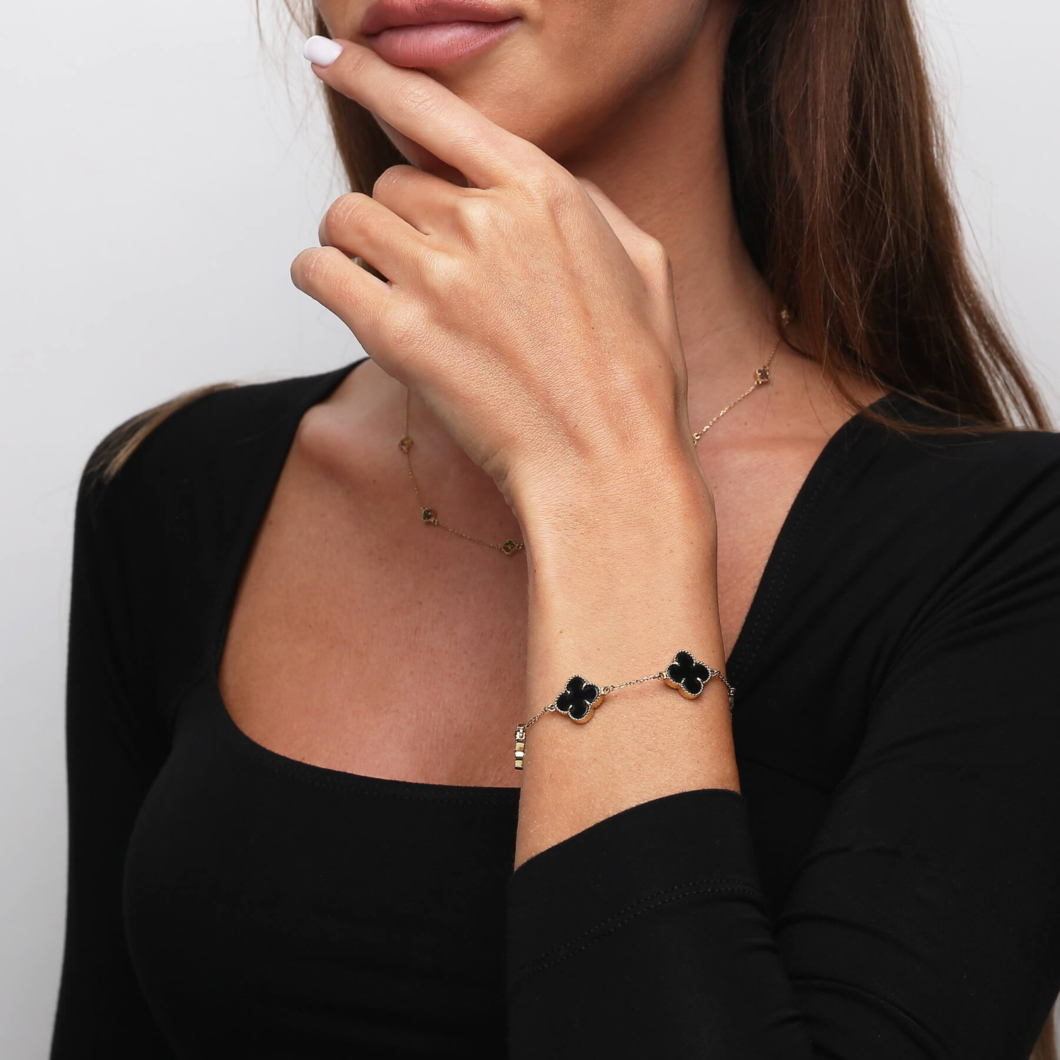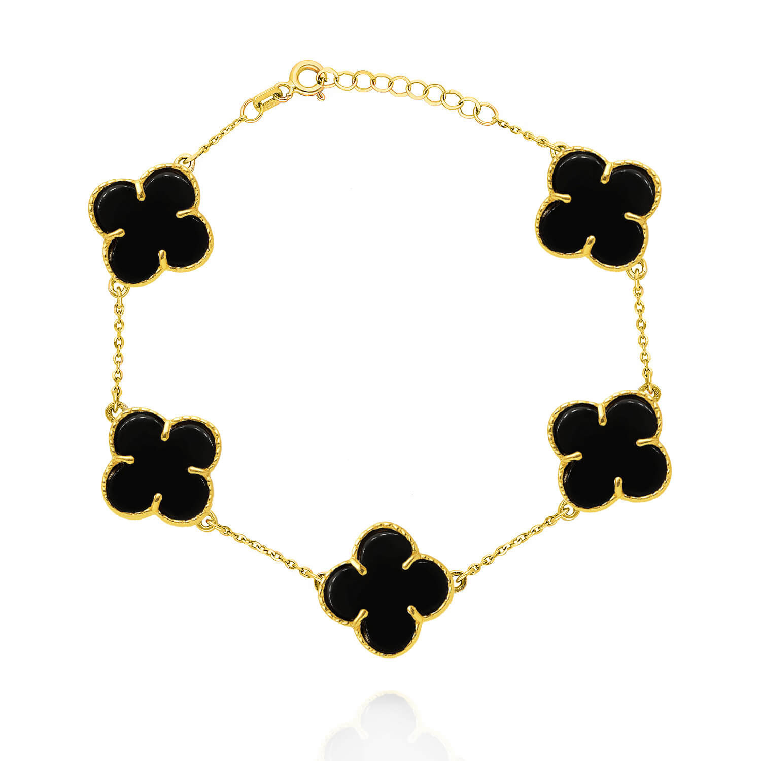Goldarmband mit großen schwarzen Kleeblättern 585er Gold natürlicher Onyx-Stein