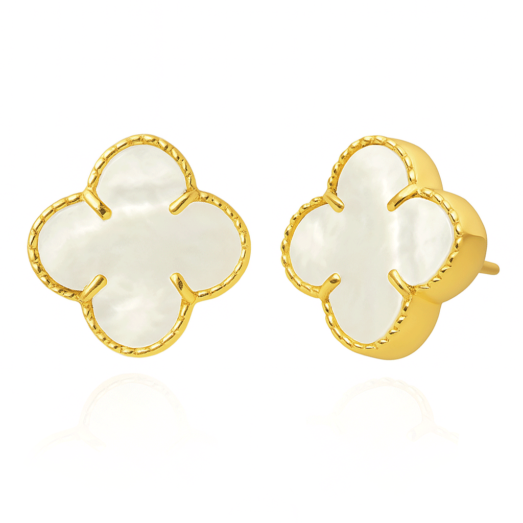 Die goldenen Klee-Ohrringe mit Perlmutt- und Diamantbesatz aus 585er (14K) Gold sind eine Kombination aus Eleganz, Modernität und Raffinesse. Der Diamantbesatz, ein Präzisionsschliff auf der Oberfläche des Goldes, verleiht dem Schmuckstück einen zusätzlichen Glanz, der die Blicke auf sich zieht und das Licht reflektiert. Sie sind die perfekte Wahl für eine Vielzahl von Anlässen - vom alltäglichen Styling bis hin zu eleganten Anlässen.