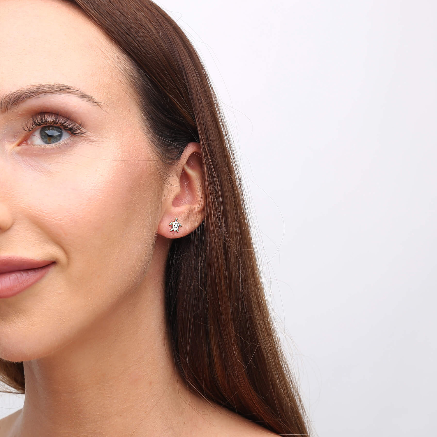 - Goldene Ohrstecker mit Schildkrötenmotiv, verziert mit weißer Emaille. Hergestellt aus hochwertigem 585er Gold (14 Karat).