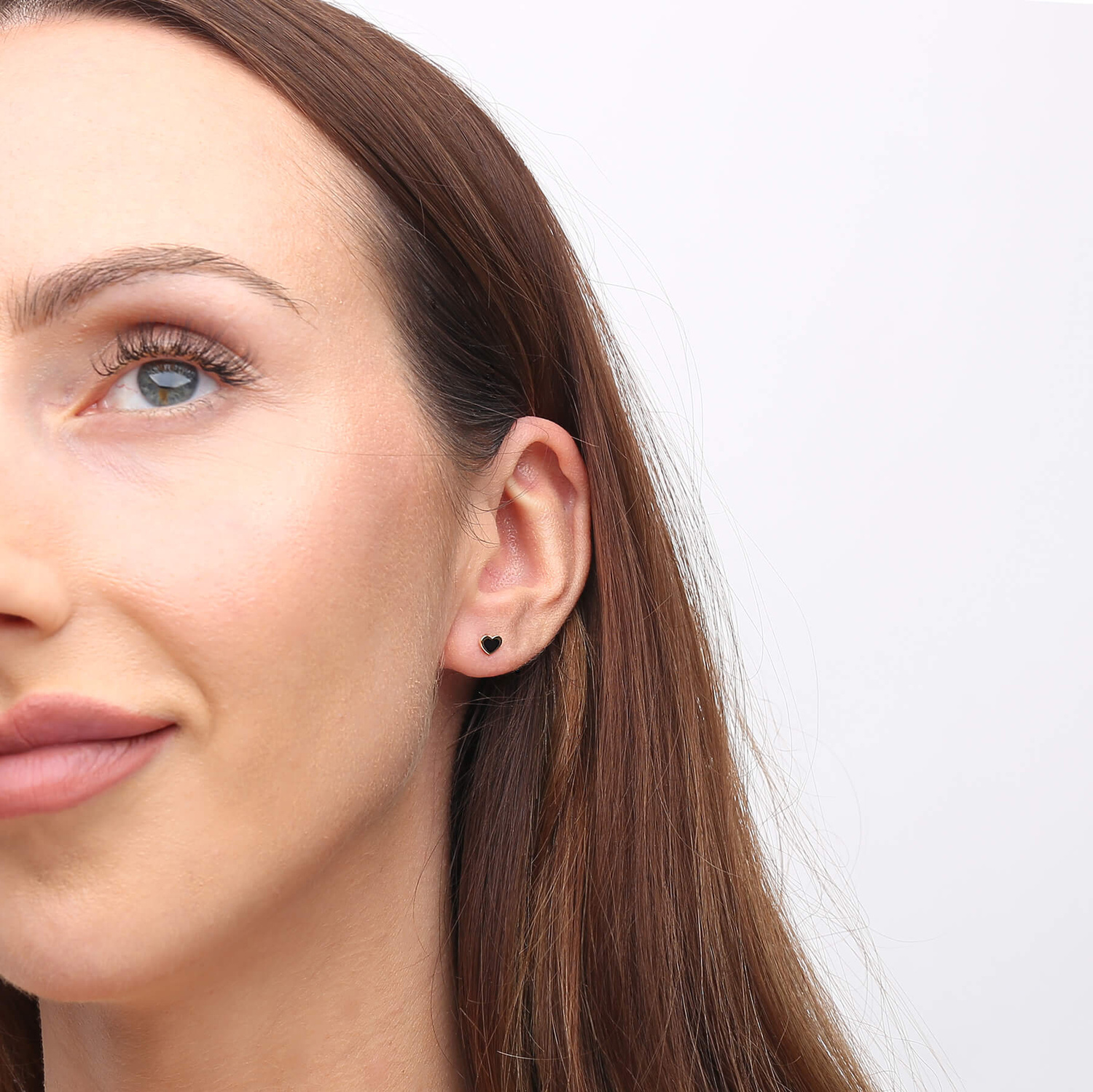Kleine goldene Herz-Ohrringe mit schwarzer Emaille, hergestellt aus hochwertigem 585er (14K) Gelbgold, das extrem widerstandsfähig gegen äußere Einflüsse ist. Die minimalistischen Ohrringe sind perfekt für das tägliche Tragen. Sie verfügen über einen bequemen Post-Verschluss.