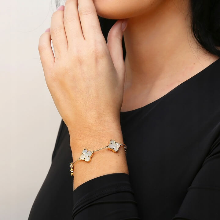 Handgefertigtes Armband aus 585er Gold (14 Karat) mit Natursteinen in Form von Kleeblättern. Das Symbol des vierblättrigen Klees erinnert uns an die vier wichtigsten Werte: Glück, Gesundheit, Liebe und Reichtum. Das Perlmutt glänzt wunderschön im Tageslicht. Das Armband wird Frauen ansprechen, die Originalität und Einzigartigkeit zu schätzen wissen.
