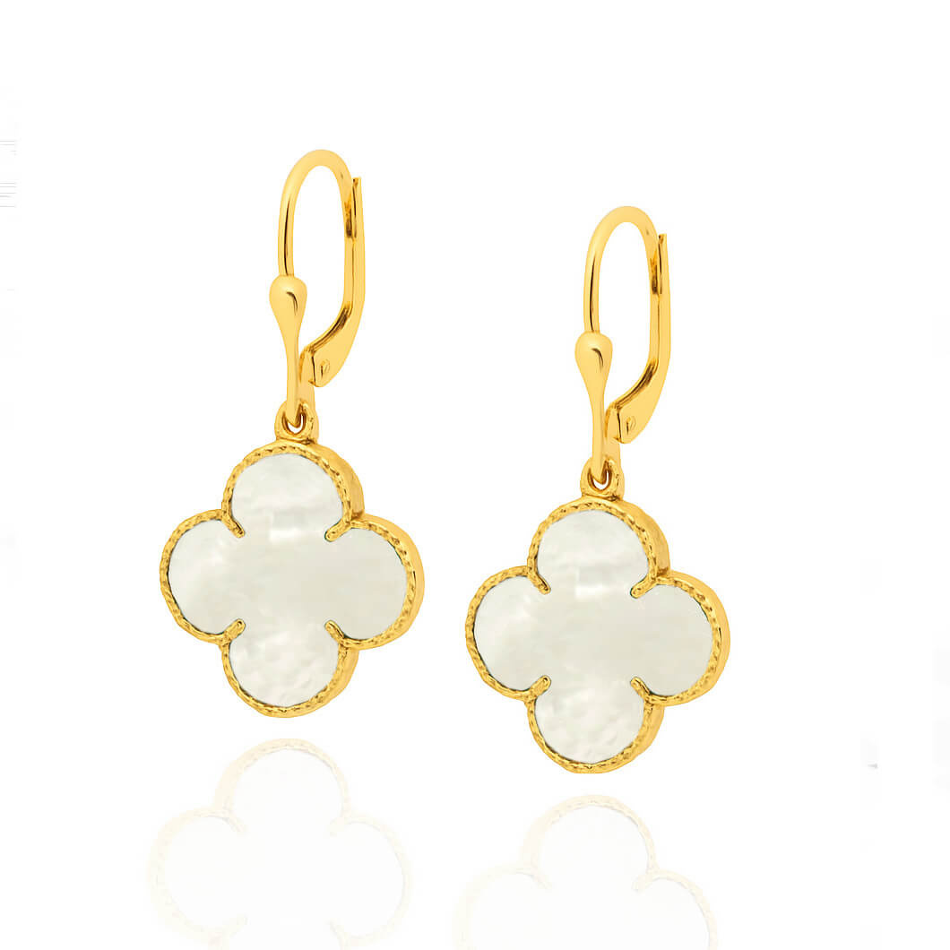 - Ohrringe aus 585er Gold mit natürlichen Perlmuttsteinen in Form von Kleeblättern mit englischer Schließe.