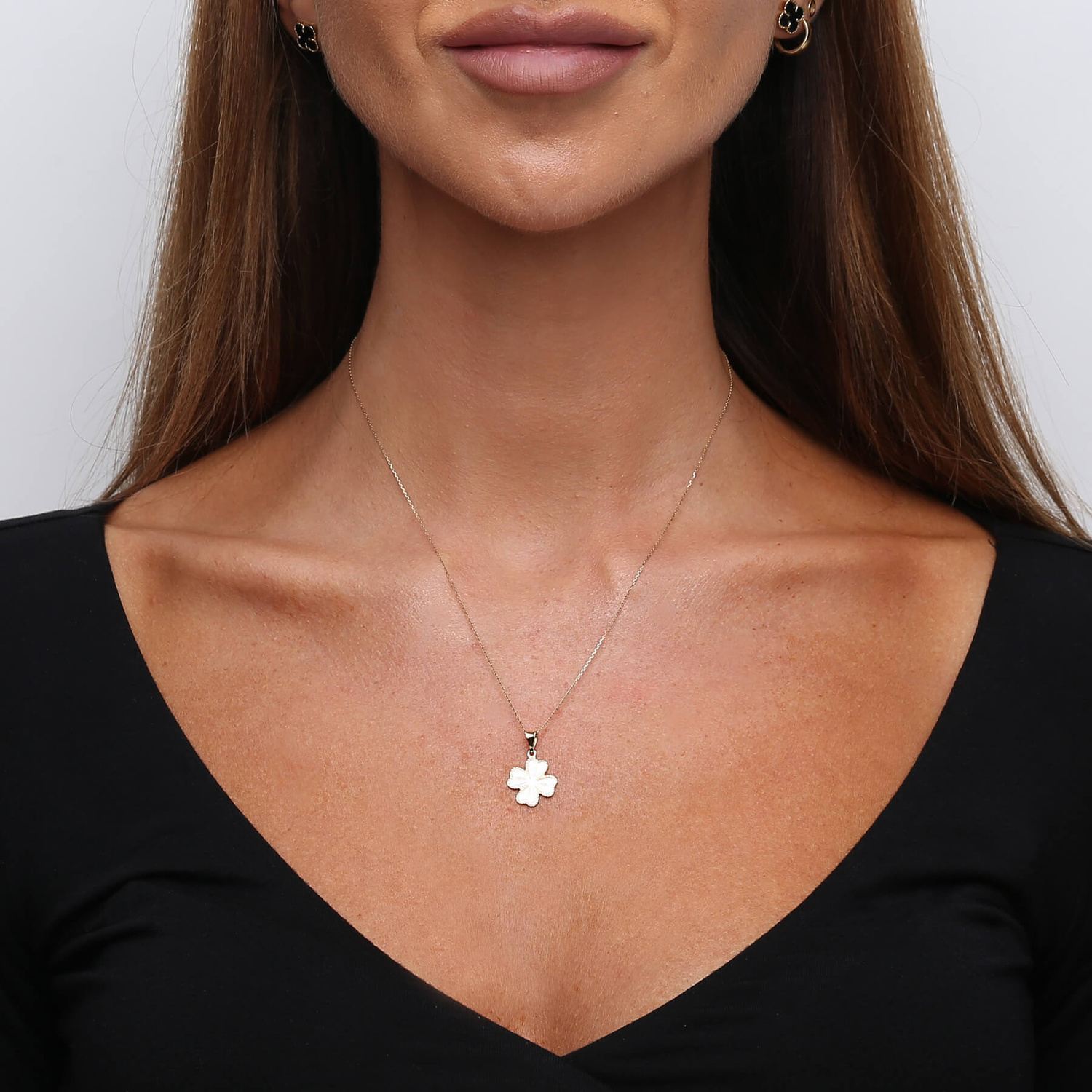 - Ein einzigartiger Kettenanhänger in Form eines Kreises mit einem Kleeblatt in der Mitte, verziert mit Zirkonen. Hergestellt aus hochkarätigem Gold 585 (14 Karat).