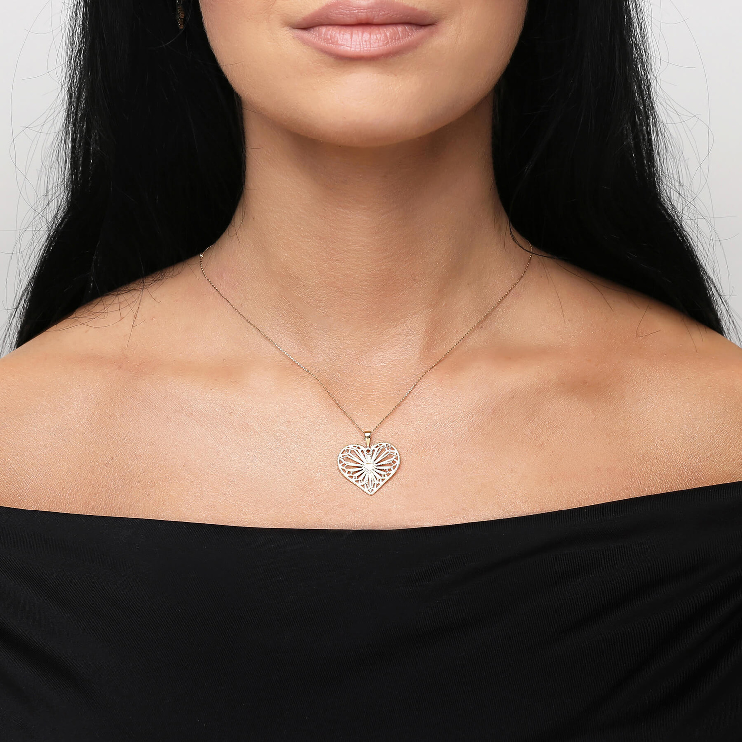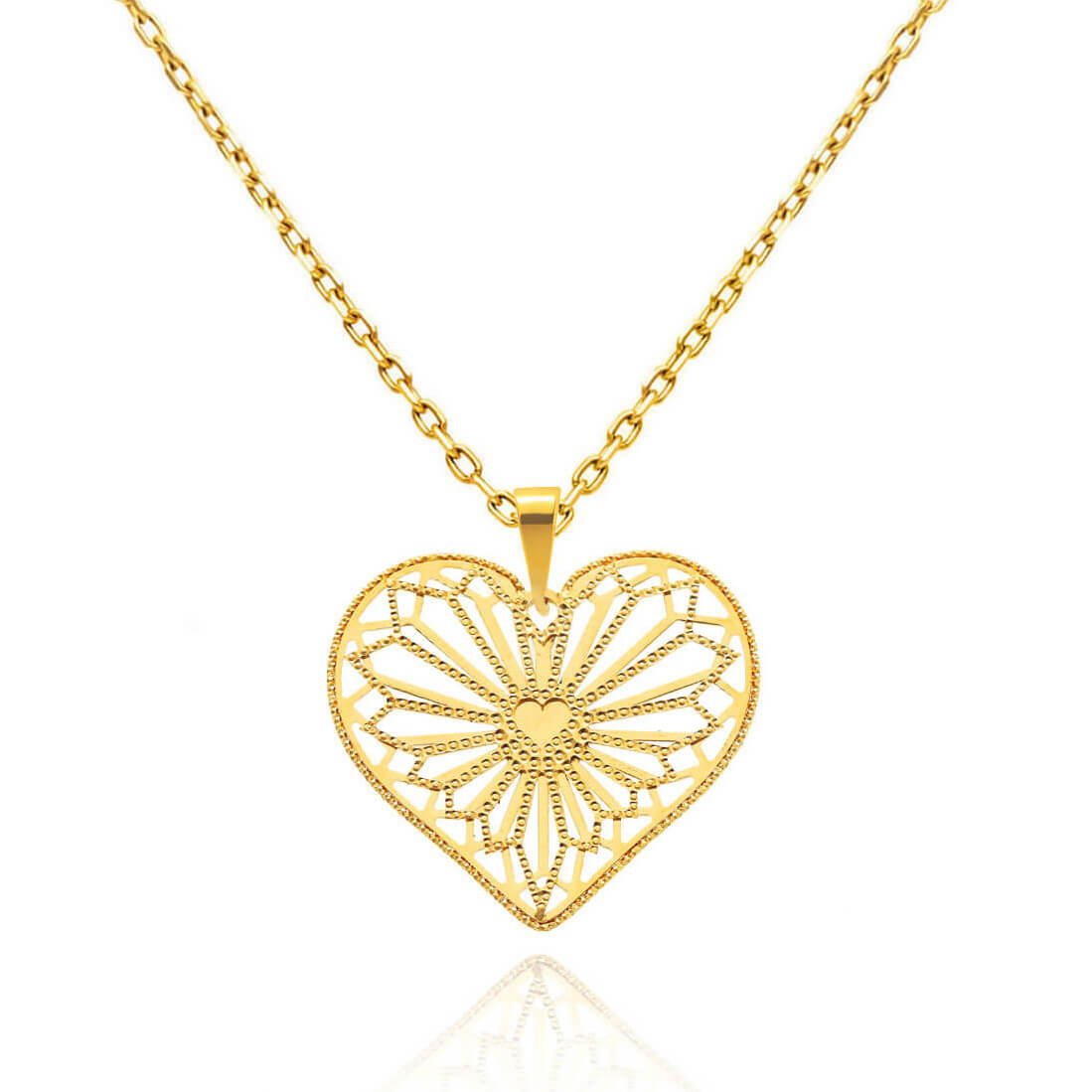 Schöner Goldanhänger in Form eines Herzens. Handgefertigt aus hochwertigem 585er Gold. Eindrucksvoller durchbrochener Anhänger, der von außen ornamental eingeschnitten ist, schimmert schön im Licht. Die perfekte Ergänzung zu vielen Looks. Der Anhänger ist die perfekte Geschenkidee für einen lieben Menschen.