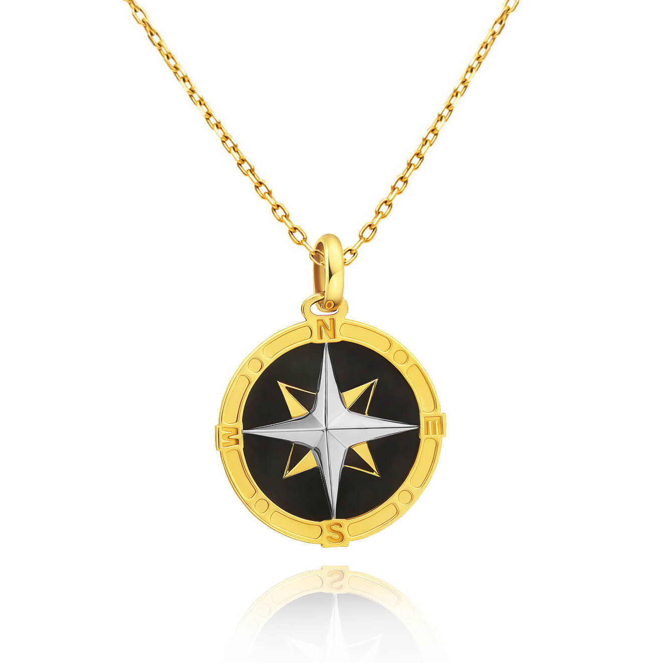 Der elegante Anhänger aus hochwertigem 585er Gelbgold (14 Karat) besticht durch seinen einzigartigen Stil, der Klassik und Moderne verbindet. Im Mittelpunkt des Schmuckstücks steht ein auffälliges Kompassmotiv – Symbol für Richtung, Kraft und Unabhängigkeit – vor einem tiefschwarzen Hintergrund aus glattem Emaille. Die sorgfältig polierte Oberfläche des Goldes bildet einen schönen Kontrast zum schwarzen Hintergrund und schafft eine Komposition voller Charakter und Raffinesse. Er kann täglich als persönlicher Talisman oder als auffälliges Accessoire zu Abendgarderobe getragen werden. Er passt perfekt zu einer Kette mit Anker-, Panzer- oder Figaro-Glieder.