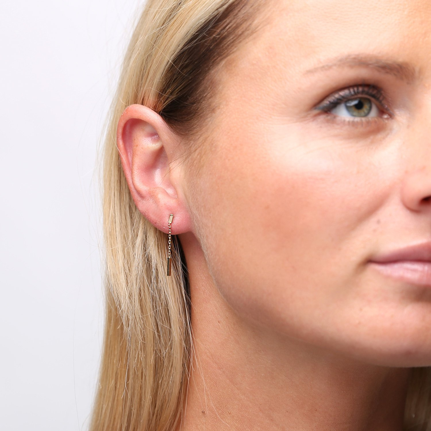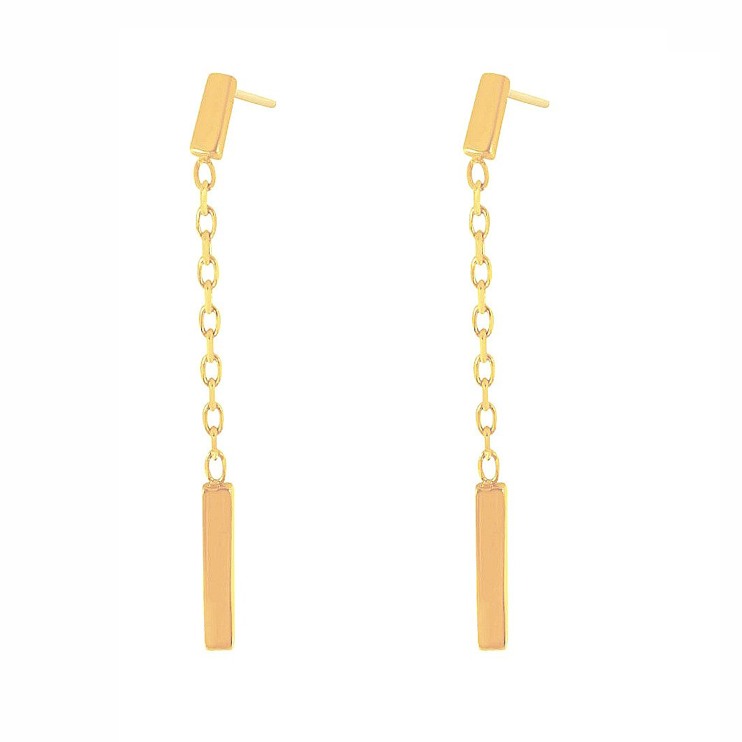 Elegante und feminine Ohrringe hängende Stäbe an Ketten. Hergestellt aus Gold von Standard 585. Stabile Befestigung stift. Diese modischen und modernen Ohrringe sind sowohl für den Alltag als auch für besondere Anlässe geeignet und machen einen schönen Eindruck.Für Damen, die ein zartes Styling mögen.