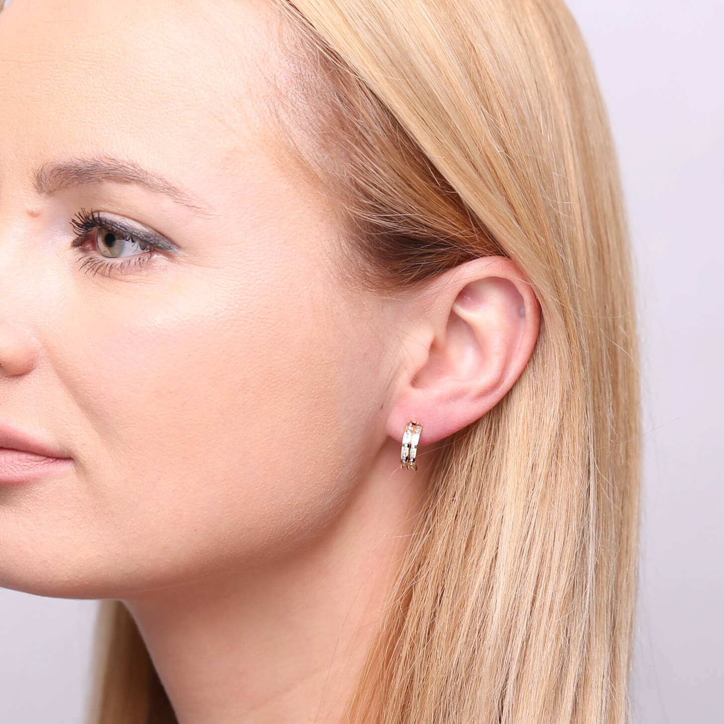 - Goldohrringe mit Zirkonen an einem Pfosten. Hochwertiges 585er Gold, das am widerstandsfähigsten gegen äußere Einflüsse ist.