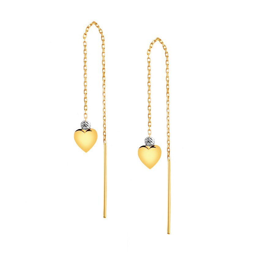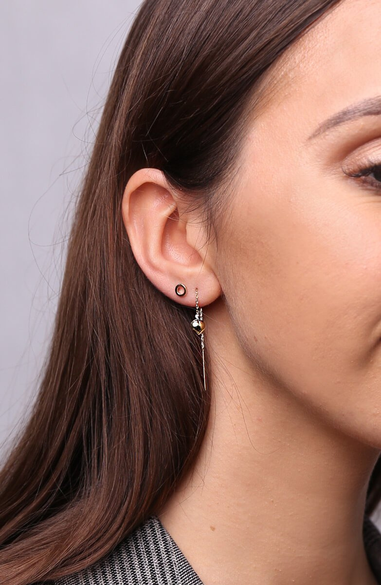 Gold-Ohrringe durch das Ohr gezogen, an einer Kette mit einem Herz und Kugeln aus Weißgold gold 585. Perfekt als Geschenk für einen lieben Menschen. Drapierte Ohrringe sind ein einzigartiges Schmuckstück, das eine tolle Ergänzung zum Styling ist.