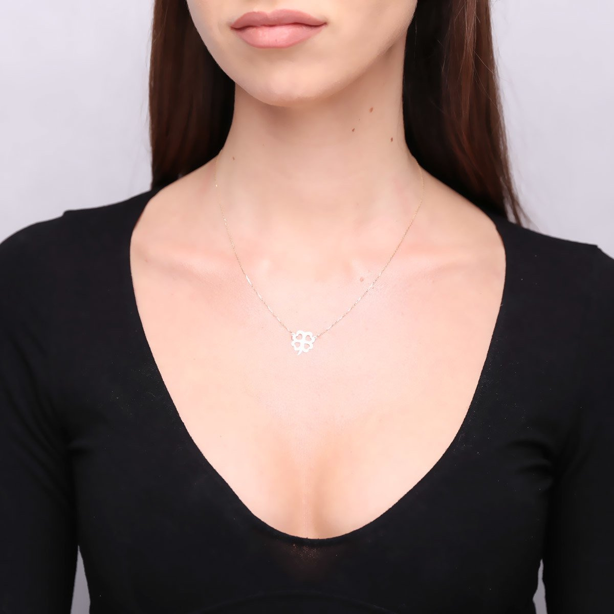 Originelle Festtagskette mit einem schlichten Anhänger in Form eines vierblättrigen Kleeblatts. Hergestellt aus hochwertigem Gelbgold 585 (14 Karat). Das Kleeblatt ist ein beliebtes Glückssymbol. Sie schützt auch vor dem Bösen.