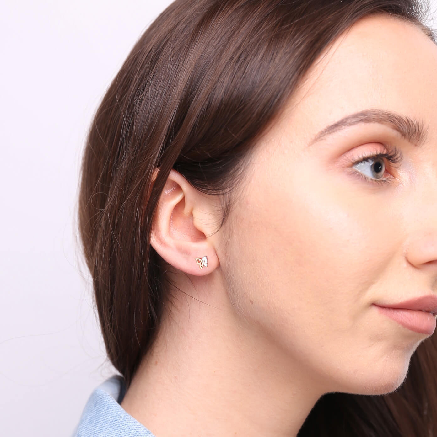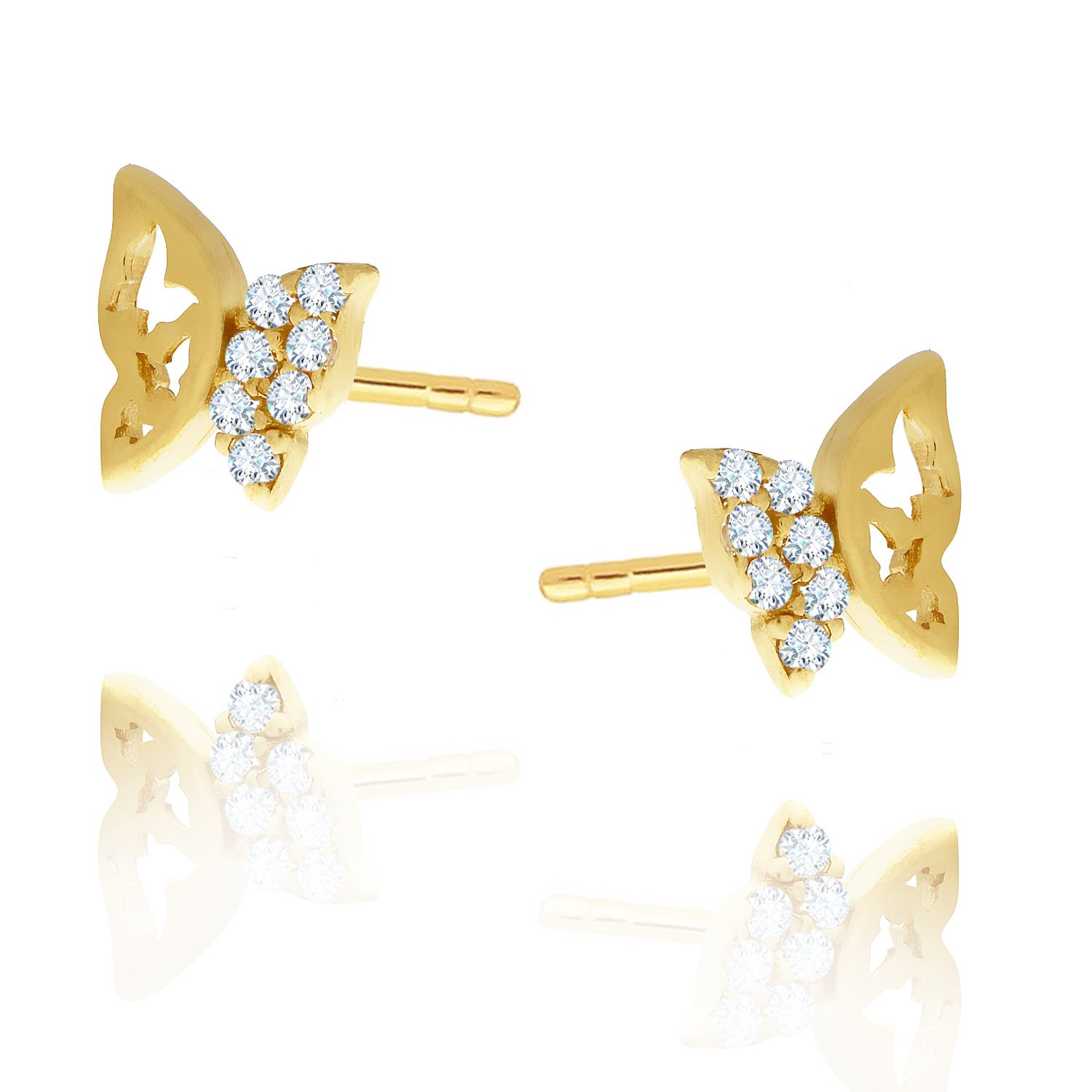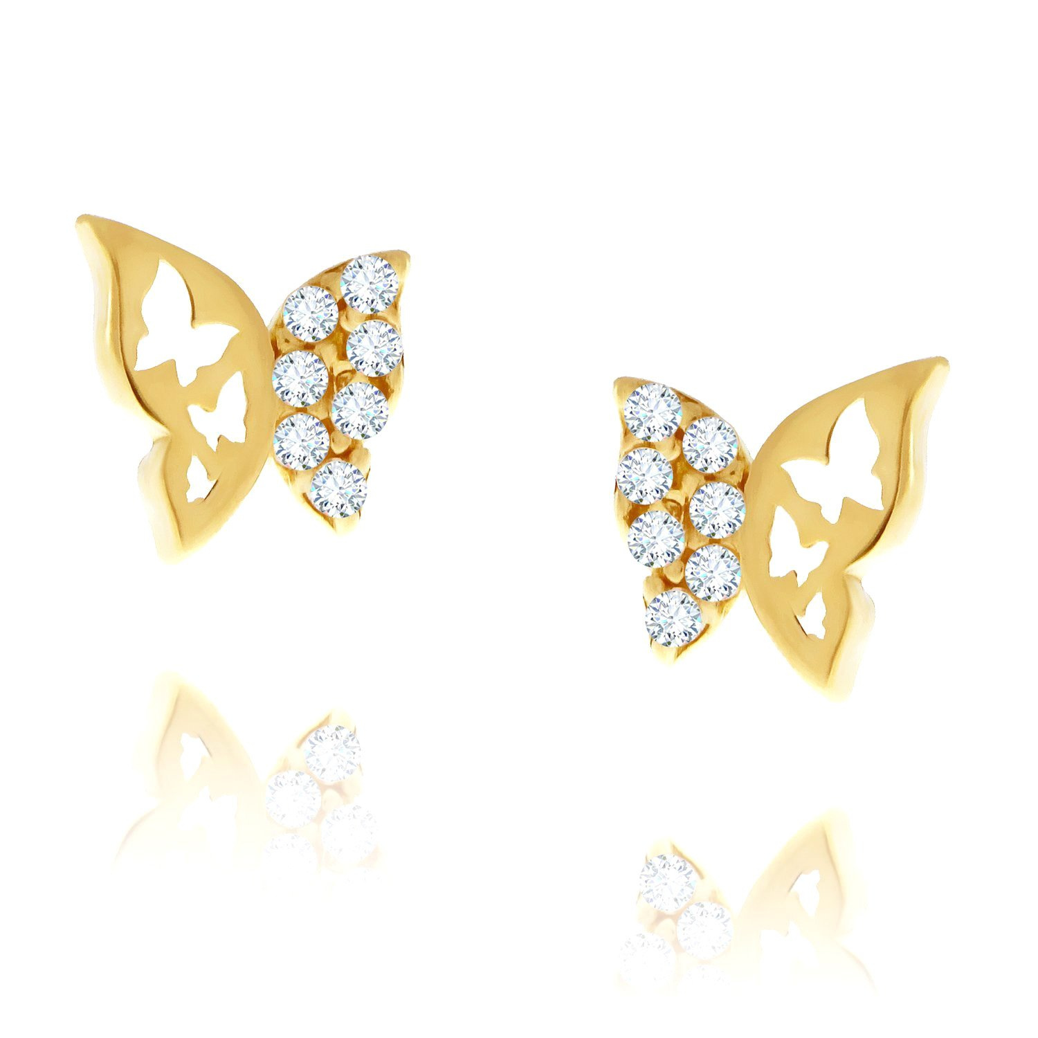 - Goldene Schmetterlingsohrringe. Hochwertiges 585er Gold, das am widerstandsfähigsten gegen äußere Einflüsse ist.
