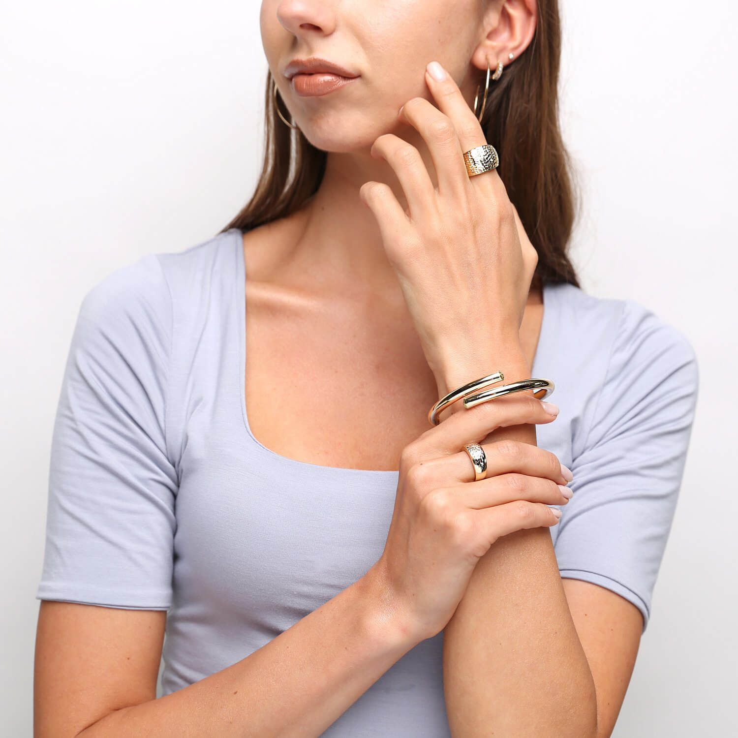 - Modisches starres Armband aus 585er Gold. Die glatt polierte Oberfläche lässt sie wunderschön schimmern. Weißgoldspitzen zusätzlich mit Diamanten besetzt.
