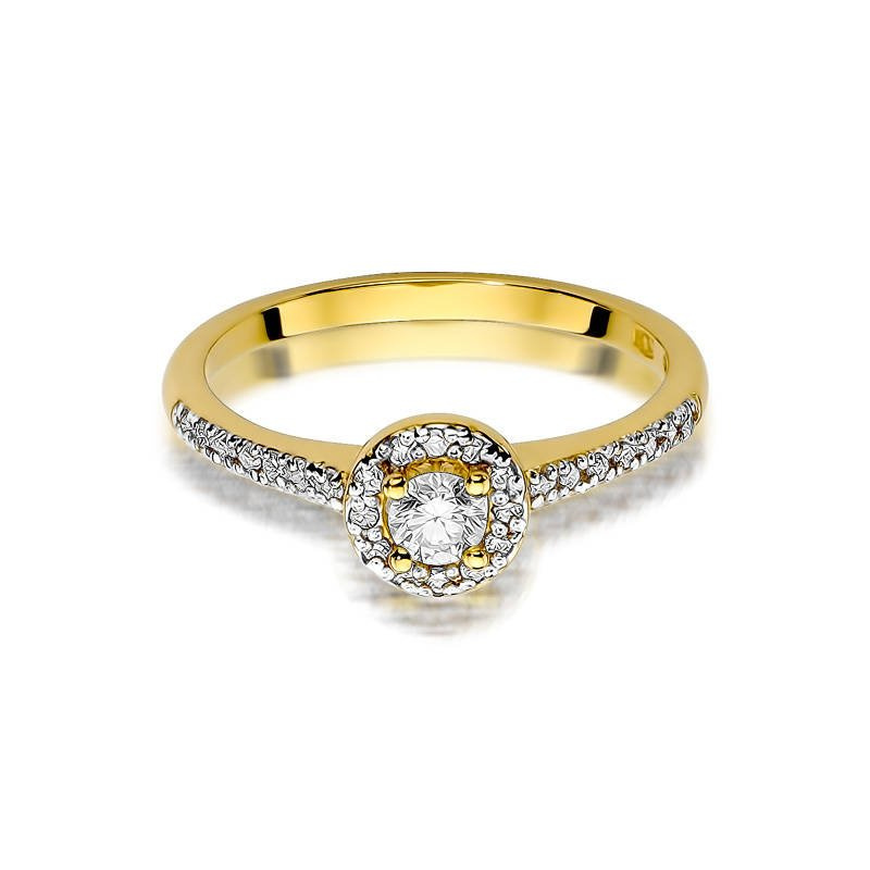 - Verlobungsring aus Gold mit mittig gefasstem Diamanten von 0,30 ct. Zusätzlich umgeben von 26 kleineren Diamanten mit einem Gesamtgewicht von 0,22 ct. Hergestellt aus hochreinem 585er Gold feinster Qualität.