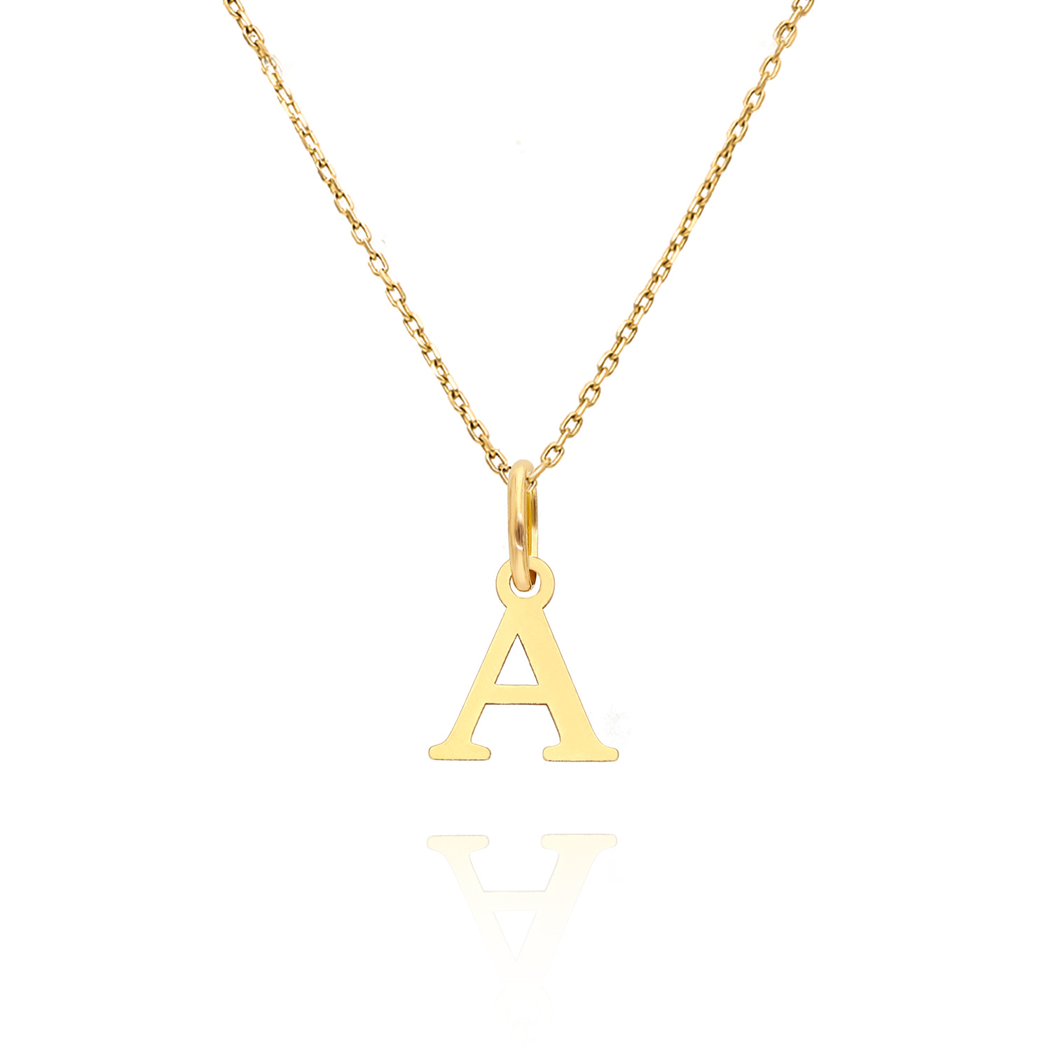 Gold-Anhänger Buchstabe A, aus gelbem 14-karätigem Gold (Muster 585). Die Beschriftung ist klein und minimalistisch, passt zu jeder zarten Kette wie Fußkettchen, Singapur oder dekorativer - Fuchsschwanz. Der Buchstabe J ist das perfekte Geschenk für Frauen zu ihrem Geburtstag oder Namenstag.