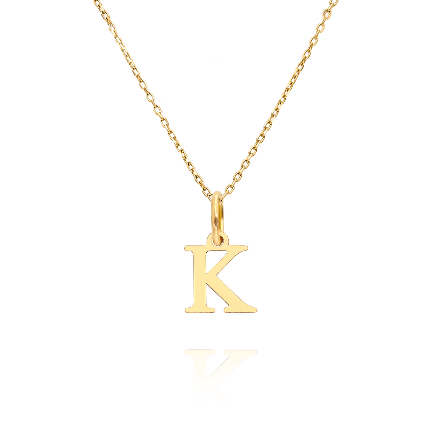 Gold-Anhänger Buchstabe K, aus gelbem 14-karätigem Gold (Muster 585). Die Beschriftung ist klein und minimalistisch, passt zu jeder zarten Kette wie Fußkettchen, Singapur oder dekorativer - Fuchsschwanz. Der Buchstabe J ist das perfekte Geschenk für Frauen zu ihrem Geburtstag oder Namenstag.