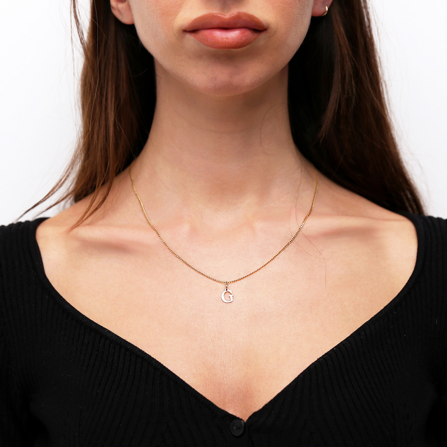- Ein Goldanhänger in der schlichten Form des Buchstabens G, hergestellt aus 585er Gold.