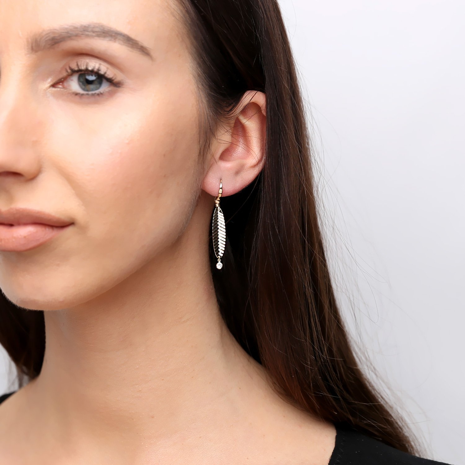 - Auffällige Anhänger-Ohrringe mit Federmotiv. Die Diamantfassung lässt die Ohrringe wunderschön schimmern.