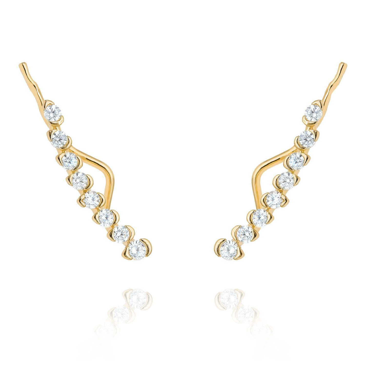 - Ohrringe mit weißen Zirkonen. Handgefertigt aus hochreinem Gelbgold 585 (14 Karat). Verziert mit weißen Zirkonia, die die Lichtstrahlen schön reflektieren. Verzieren Sie die Ohren in der Breite.