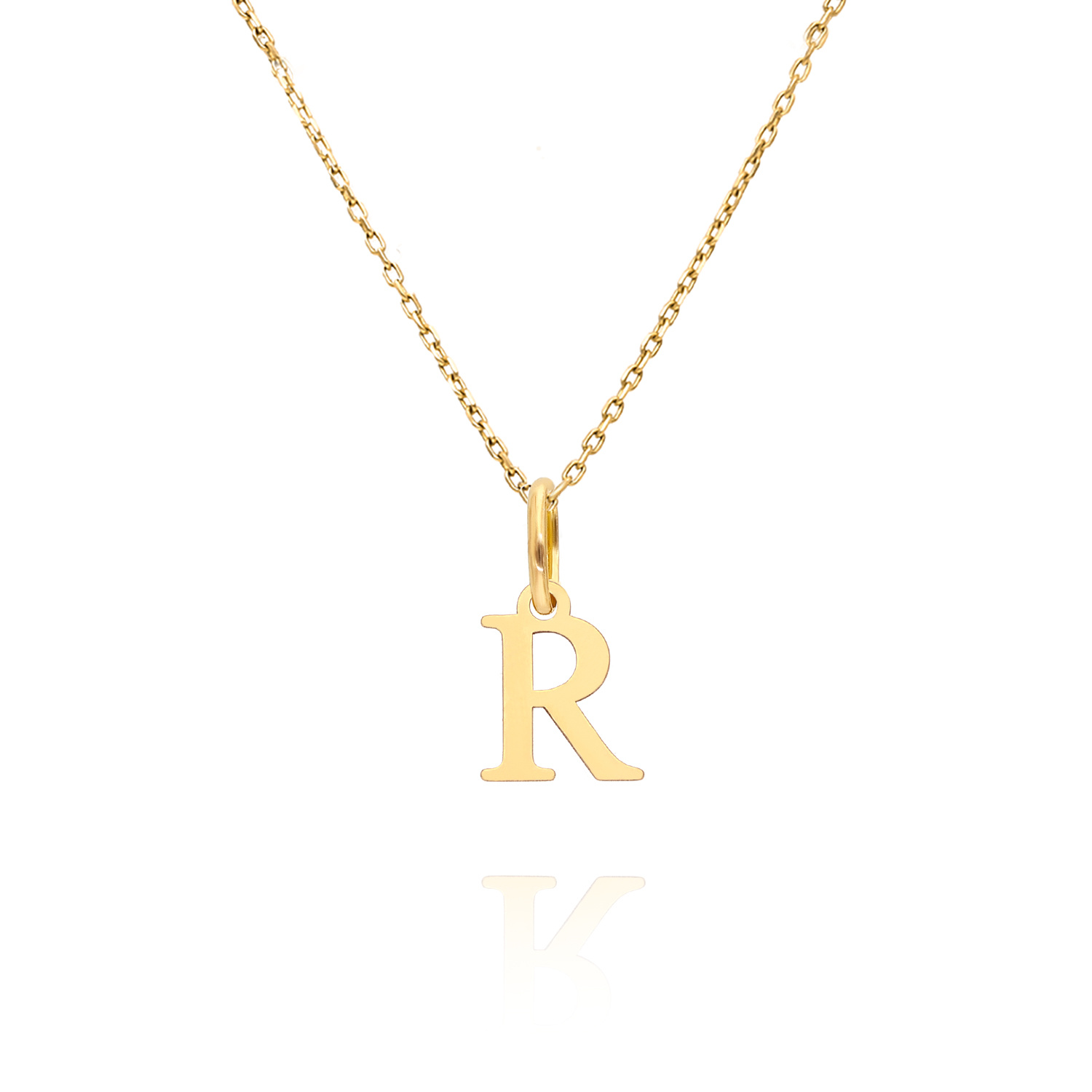 Gold-Anhänger Buchstabe R, aus gelbem 14-karätigem Gold (Muster 585). Die Beschriftung ist klein und minimalistisch, passt zu jeder zarten Kette wie Fußkettchen, Singapur oder dekorativer - Fuchsschwanz. Der Buchstabe R ist das perfekte Geschenk für Frauen zu ihrem Geburtstag oder Namenstag.