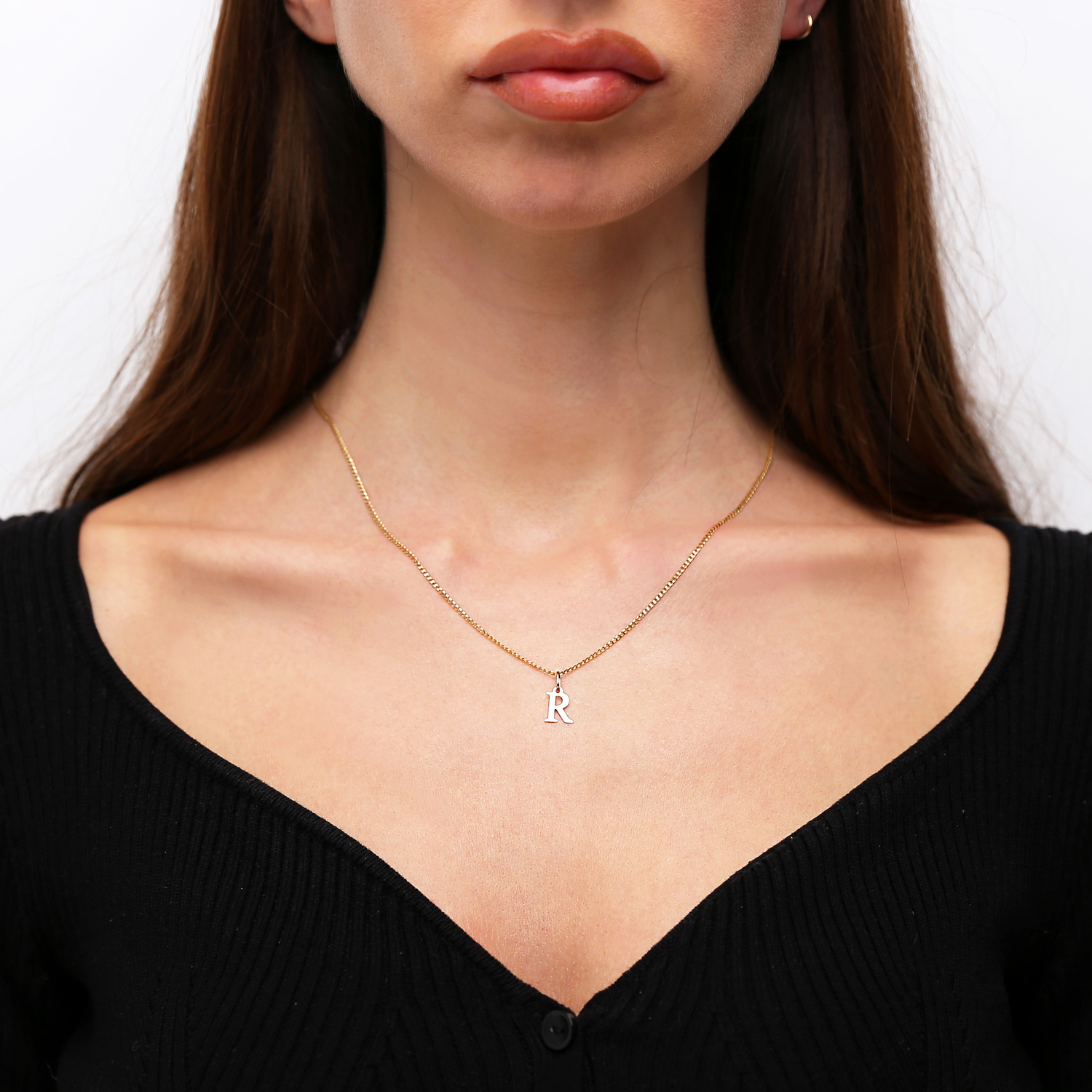 - Ein Goldanhänger in der schlichten Form des Buchstabens R, hergestellt aus 585er Gold.