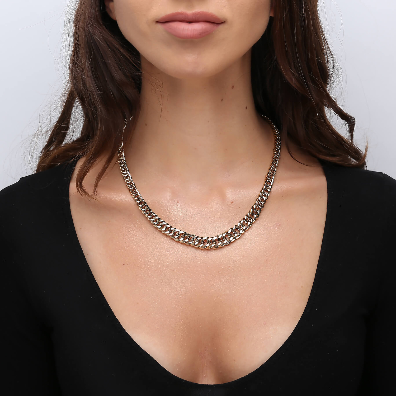 Massive goldene Panzerkette Halskette. Glatt polierte Oberfläche. Hergestelltder Goldprobe 585. Dank ihrer Größe wirkt die Halskette am Dekolleté sehr eindrucksvoll. Das Panzergeflecht ist modern und klassisch in einem.