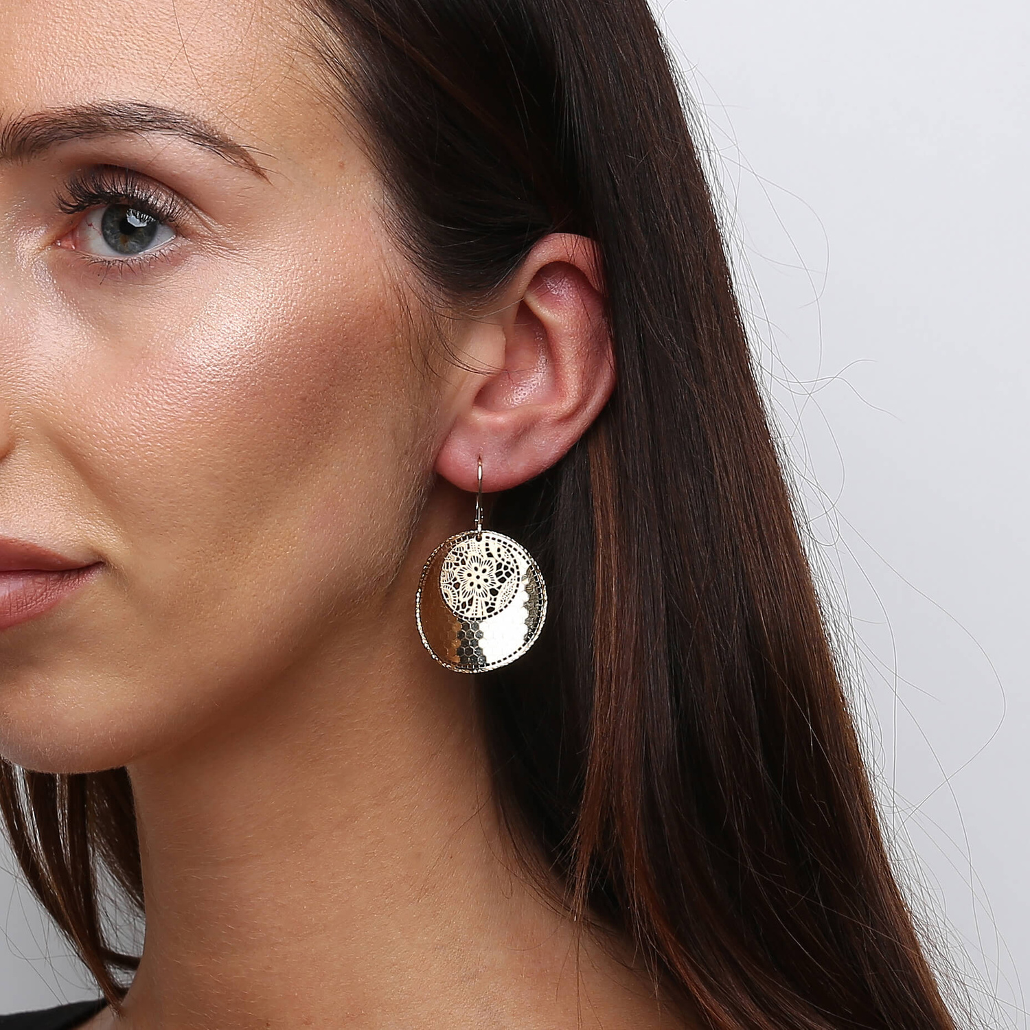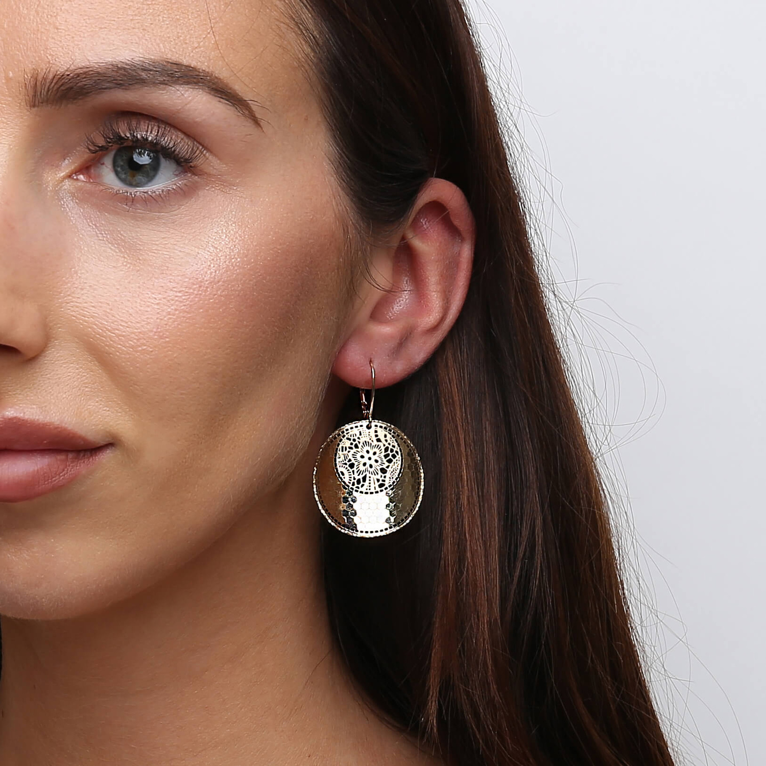 - Schöne Anhänger-Ohrringe in Form von durchbrochenen Kreisen. Ein schönes Accessoire für viele Gelegenheiten.