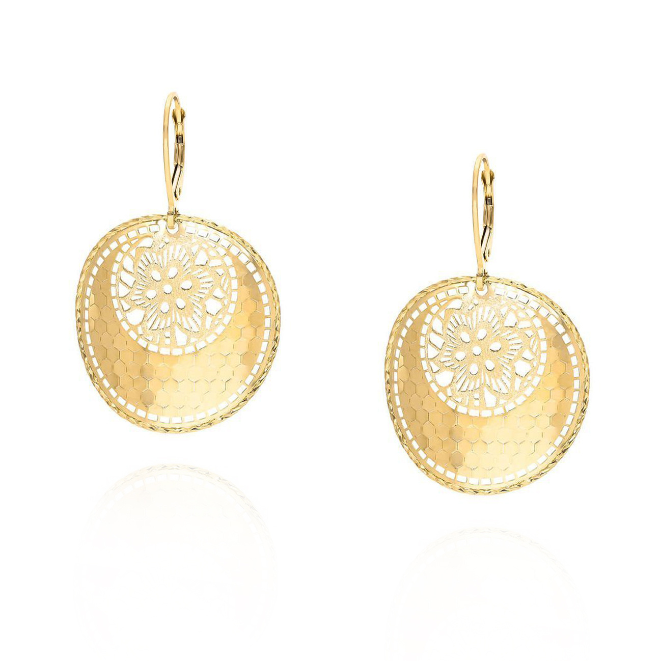 Durchbrochene Ohrringe aus Gold in Form von hängenden Kreisen mit Blumenmotiv. Sie haben einen bequemen und robusten Ohrwurm-Verschluss.. Hergestellt aus hochreinem Gold - 585. Ideal für das Tragen im Alltag und am Abend mit hochgestecktem Haar. Die originelle, geschwungene Form der Ohrringe lässt sie im Licht schön schimmern, und die durchbrochene Verzierung verleiht ihnen Raffinesse.