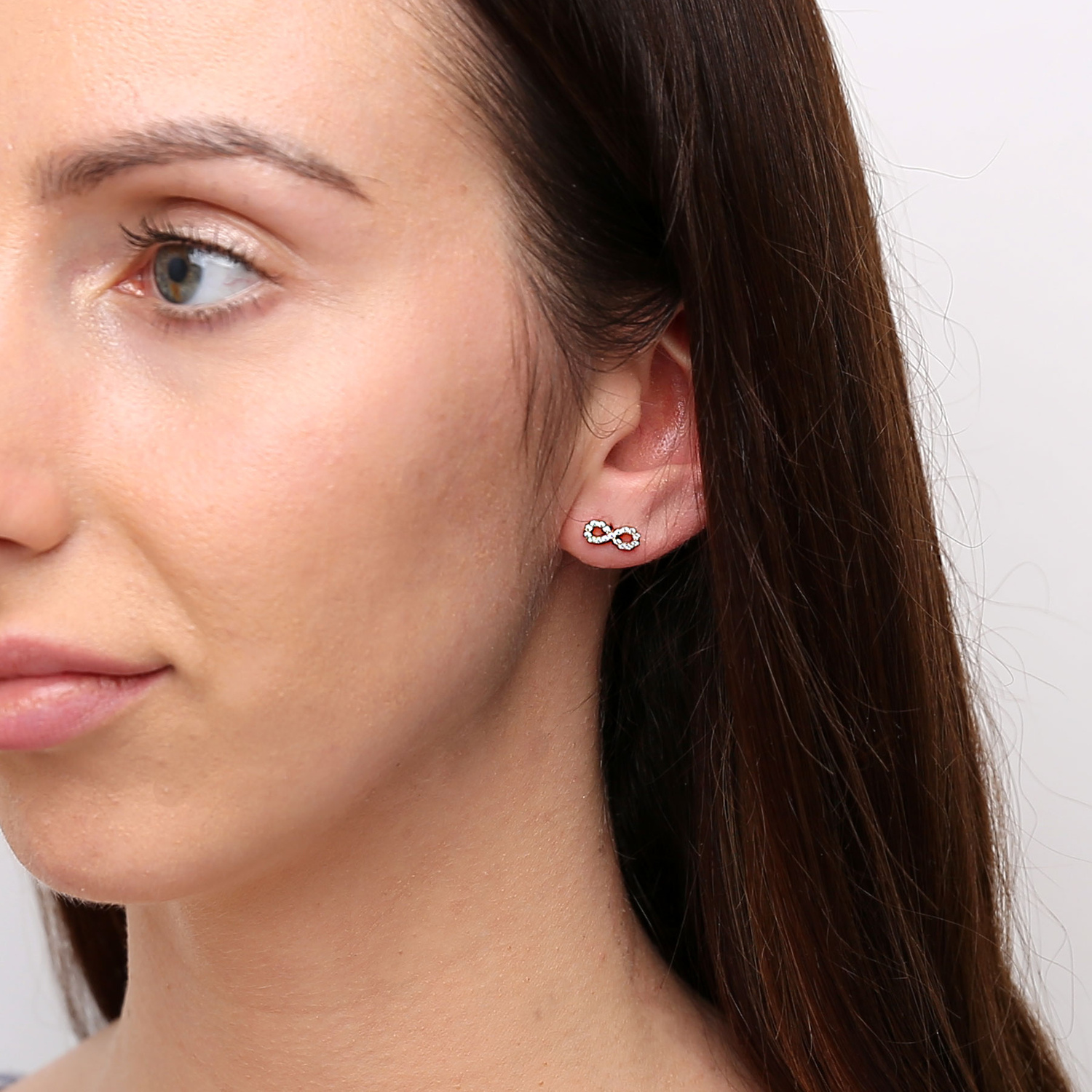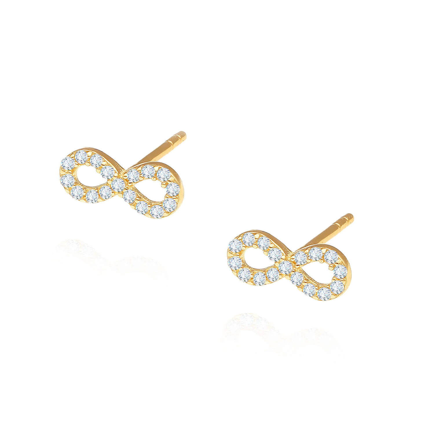 Ohrringe mit Unendlichkeitszeichen in Gold. Handgefertigt mit größter Sorgfalt aus hochwertigem 585er Gold (14 Karat Gold). Die Verzierung mit Zirkonen macht die Ohrringe, obwohl subtil und zart, schimmern schön im Licht und ziehen die Augen an. Stiftförmige Befestigung. Es ist die perfekte Wahl als Geschenk für viele Gelegenheiten für einen besonderen Menschen.