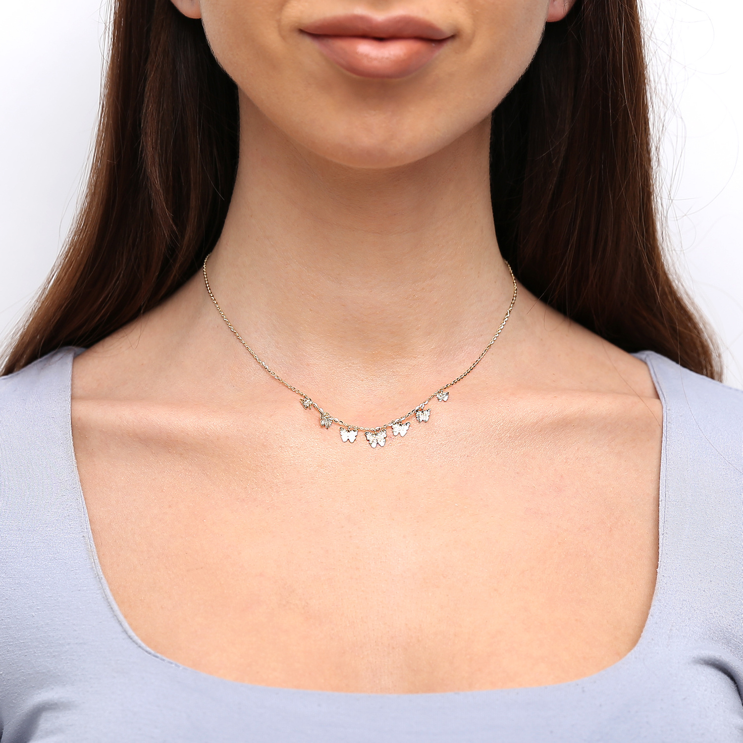 Zartes goldenes Collier mit diamantenen Schmetterlingen. Handgefertigt aus hochwertigem 585er Gold. Eine zarte Kette in Fußkettchenform mit 7 schmetterlingsförmigen Anhängern, die im Licht schön schimmern. Einstellbar nach Ihren Wünschen.