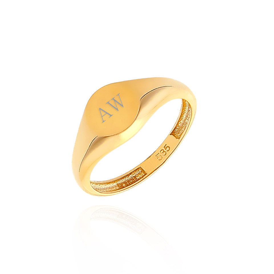 Charmanter runder Siegelring aus Gold. Hergestellt aus Goldhochreiner 585er (14 Karat) - am widerstandsfähigsten gegen äußere Einflüsse. Die glatte Oberfläche des Rings lässt ihn im Licht schön glänzen. Es ist die perfekte Geschenkidee für einen besonderen Menschen zu vielen verschiedenen Anlässen.