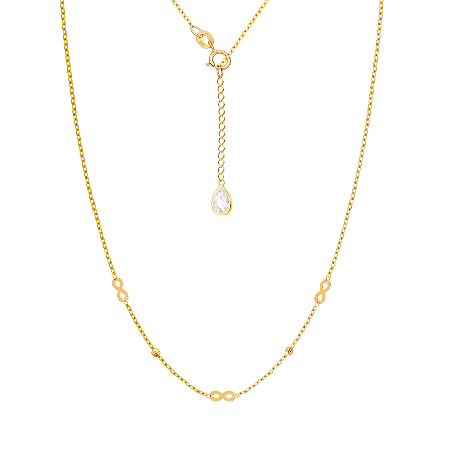 Goldene Halskette mit drei Unendlichkeits- und Diamantperlen. Hergestellt aus dem hochwertigsten 585er (14 Karat) Gold, wodurch es nicht schwarze und verliert nicht seinen Glanz. Die Halskette ist originell, charmant und funkelt schön im Licht. Perfekt als Geschenk für einen besonderen Menschen für viele Gelegenheiten.