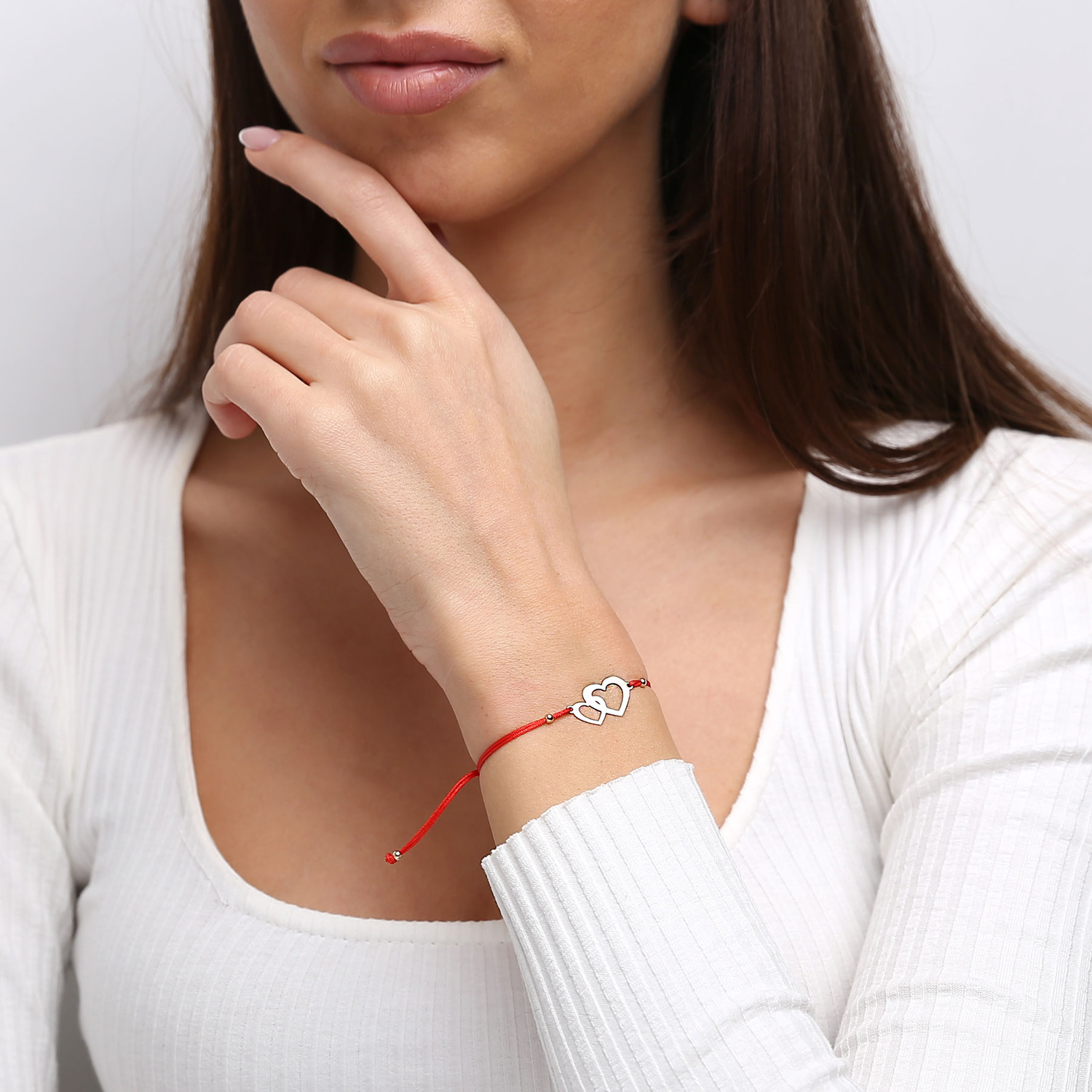 Armband an roter Kordel mit Bällen und goldenen Herzen. Hergestellt aus strapazierfähiger Kordel und 585er Sterling Gold (14 Karat). Durch Ziehen an den Knoten können Sie die Länge des Armbands so anpassen, dass es an Ihr Handgelenk passt. Dezentes, zartes Armband, das Ihrem Styling Charme verleiht.
