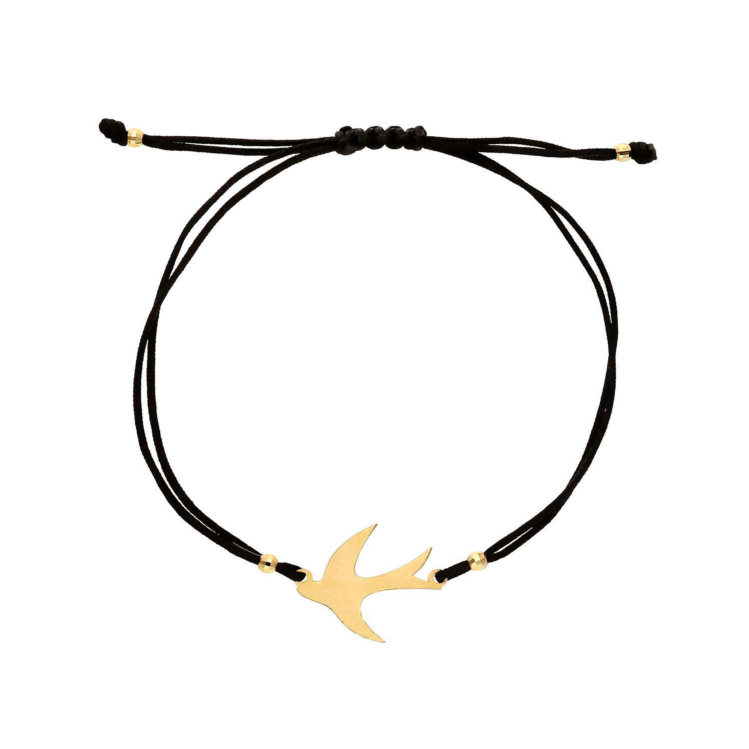 Armband an schwarzer Kordel mit Kugeln und goldener Schwalbe. Hergestellt aus strapazierfähiger Kordel und 585er Sterling Gold (14 Karat). Durch Ziehen an den Knoten können Sie die Länge des Armbands so anpassen, dass es an Ihr Handgelenk passt. Dezentes, zartes Armband, das Ihrem Styling Charme verleiht.