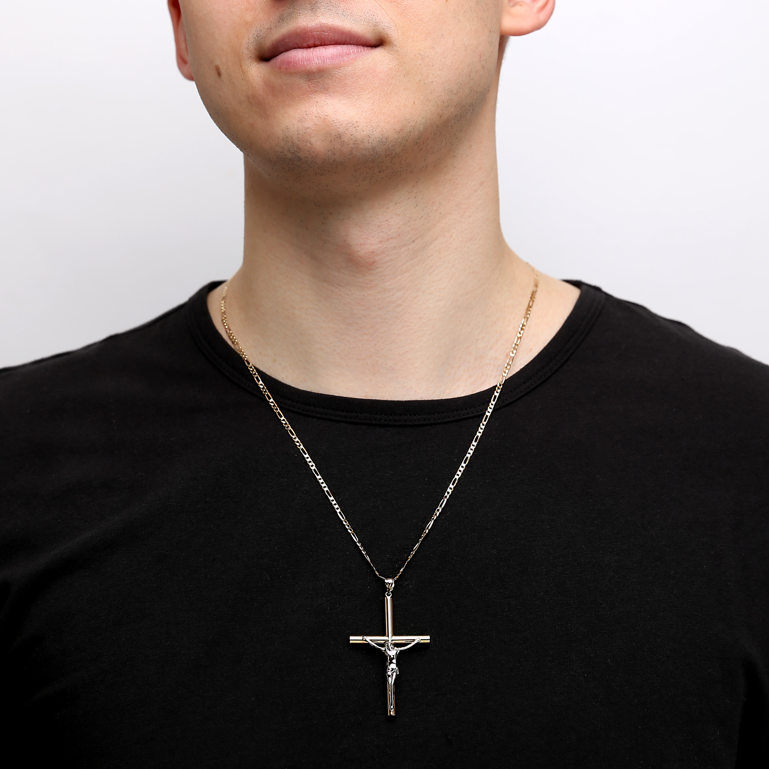 Schöner Anhänger mit dem Motiv des gekreuzigten Jesus. Handgefertigt mit größter Sorgfalt aus Weiß- und Gelbgold 585. Die Kombination aus zwei Goldfarben und die außergewöhnliche Liebe zum Detail sorgen dafür, dass die Pendelleuchte das Licht wunderschön reflektiert. Ein perfektes Geschenk zur Erstkommunion. oder Konfirmation. Wunderschönes Set mit figaro, singapur, anklet weave Kette.