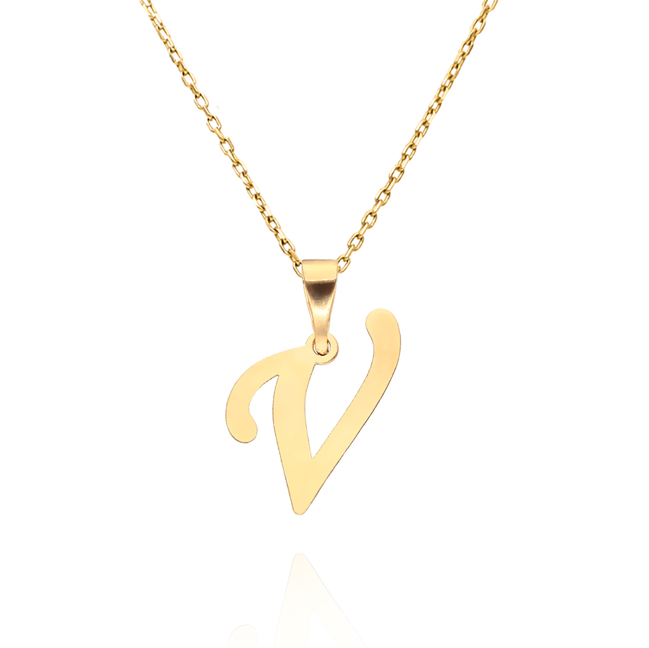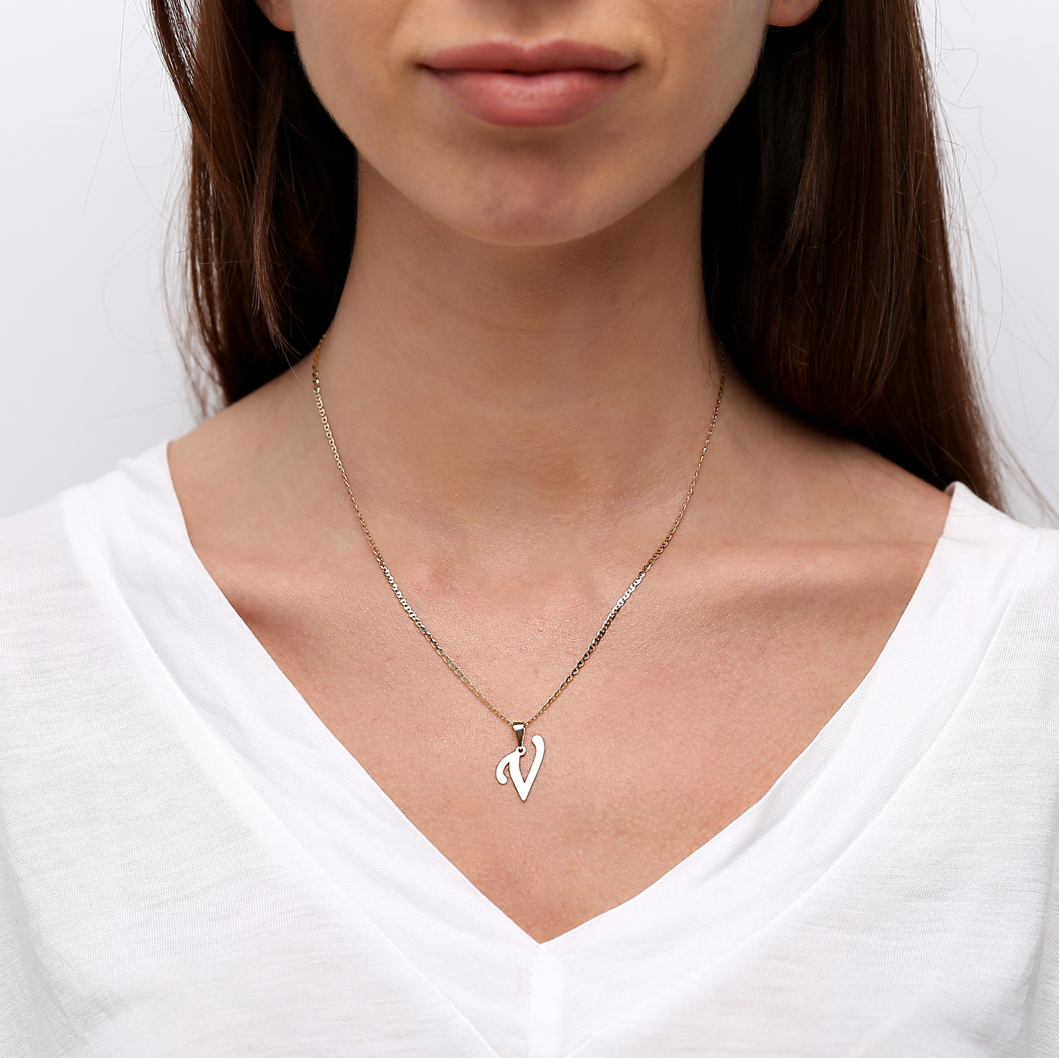 Anhänger mit dem Buchstaben V aus Gold. Hergestellt aus gelbem 14 Karat hochreinem 585er Gold, damit es über viele Jahre hinweg nicht schwarz wird oder seinen Glanz verliert. Das minimalistische, elegante Design macht passt zu jeder feinen Kette wie Fußkettchen, Singapur oder mehr dekorativ - Fuchsschwanz. Der Brief ist ein ideales Geschenk für Frauen zu Geburtstagen, Namenstagen oder anderen besonderen Anlässen.
