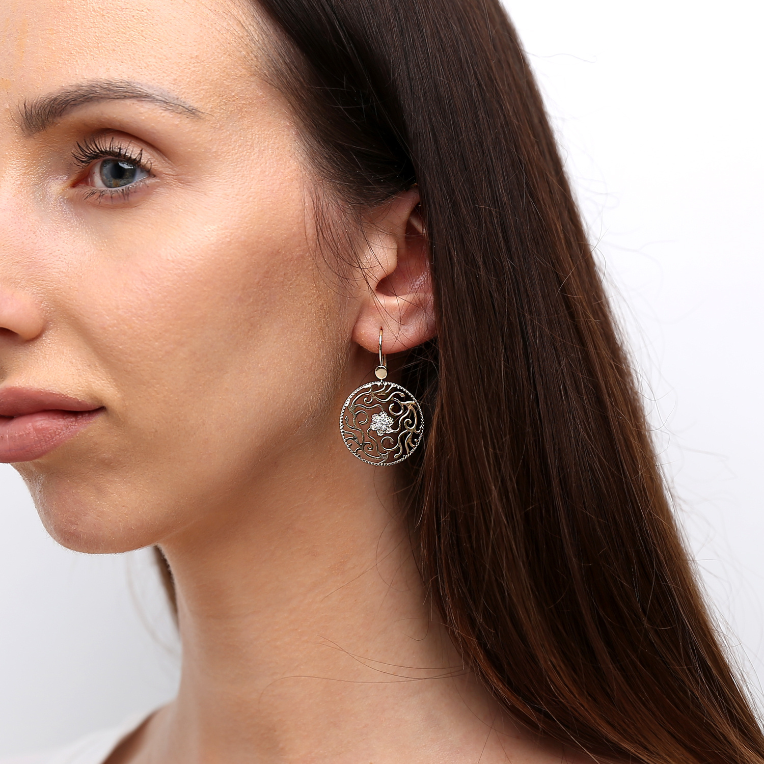 - Schöne Anhänger-Ohrringe in Form von durchbrochenen Kreisen. Ein schönes Accessoire für viele Gelegenheiten.