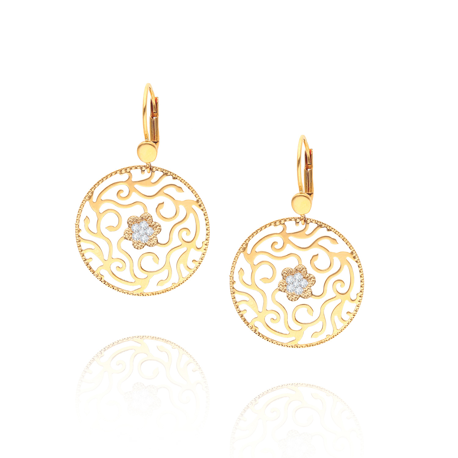 Durchbrochene Ohrringe aus Gold in Form von hängenden Kreisen mit Blumenmotiv. Sie haben einen bequemen und robusten Ohrwurm-Verschluss.. Hergestellt aus hochreinem Gold - 585. Ideal für den Alltag und den Abend mit hochgestecktem Haar. Die dezente Verzierung mit Zirkonen lässt sie im Licht schön schimmern, und die durchbrochene Form verleiht ihnen Zartheit und Charme.