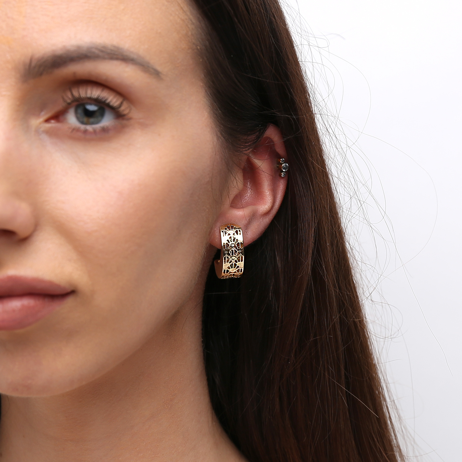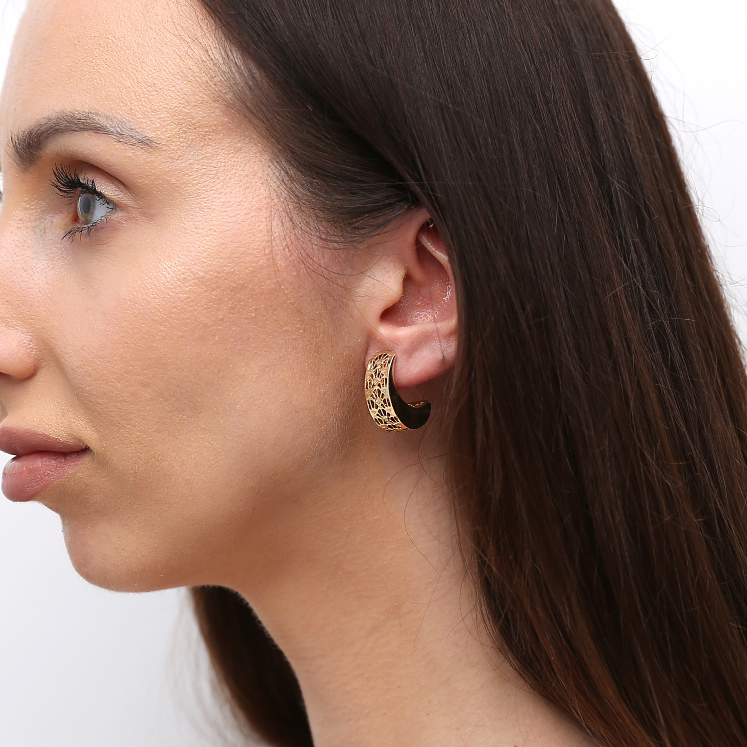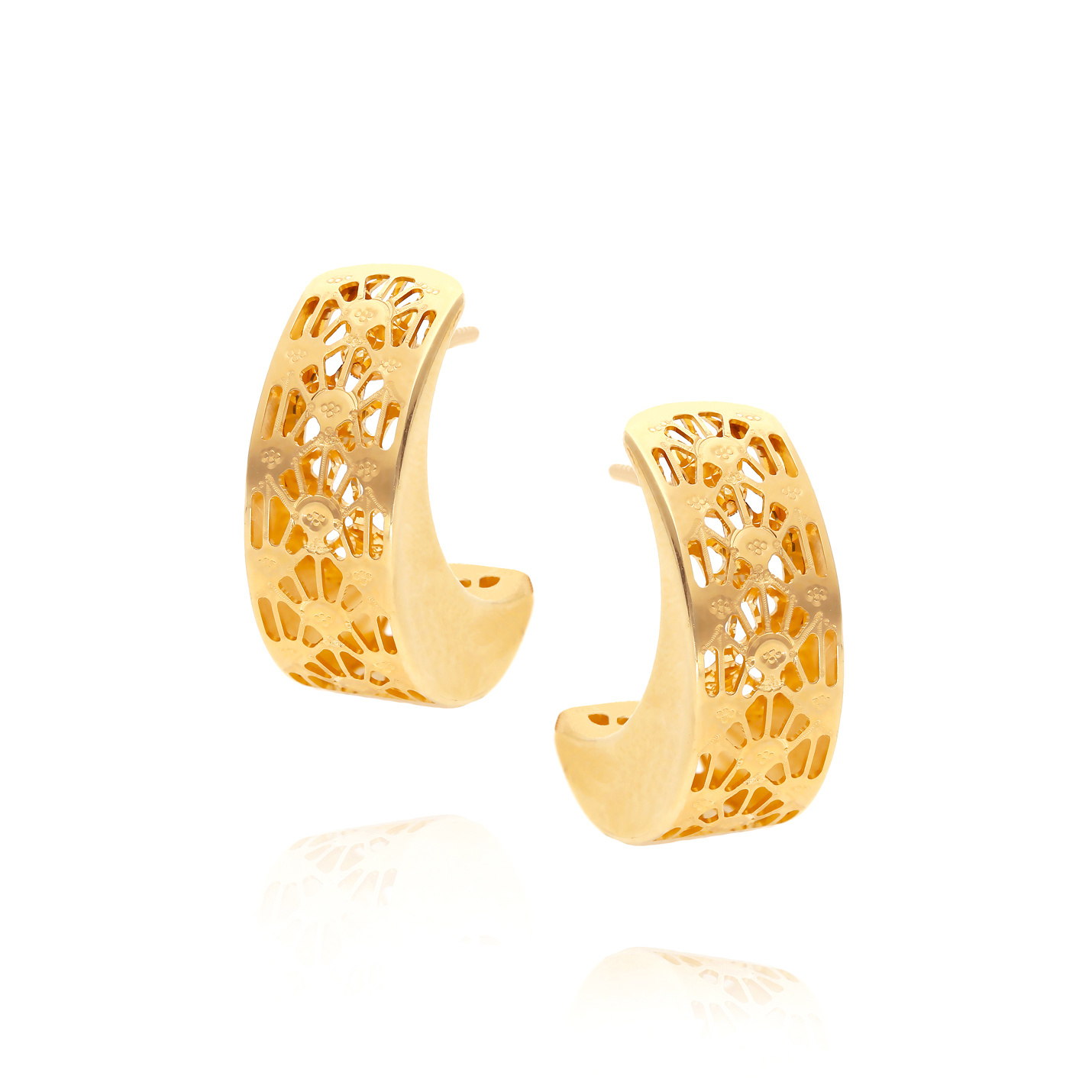 einzigartige goldene Ohrringe in Form einer Mondsichel mit durchbrochenen Ornamenten. Sie haben einen bequemen Steckverschluss. Hergestellt aus 585er Gelbgold (14 Karat). Mit ihrem schicken Aussehen werden sie Ihre natürliche Schönheit wunderbar unterstreichen. Perfekt für besondere Anlässe und den täglichen Gebrauch.