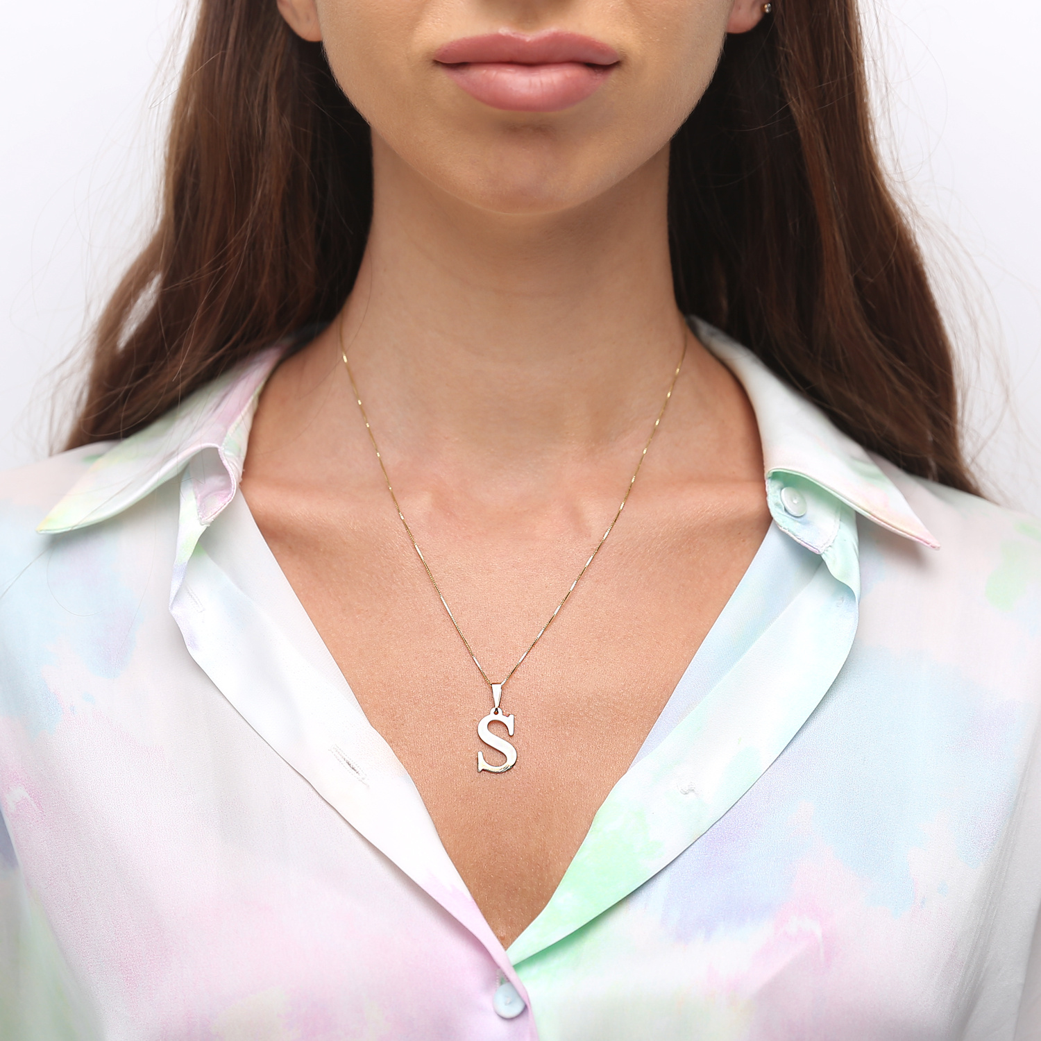 Gold-Anhänger Buchstabe S. Hergestellt aus gelbem 14 Karat hochreinem 585er Gold, damit es über viele Jahre hinweg nicht schwarz wird oder seinen Glanz verliert. Das minimalistische, elegante Design macht passt zu jeder feinen Kette wie Fußkettchen, Singapur oder mehr dekorativ - Fuchsschwanz. Der Brief ist ein ideales Geschenk für Frauen zu Geburtstagen, Namenstagen oder anderen besonderen Anlässen.