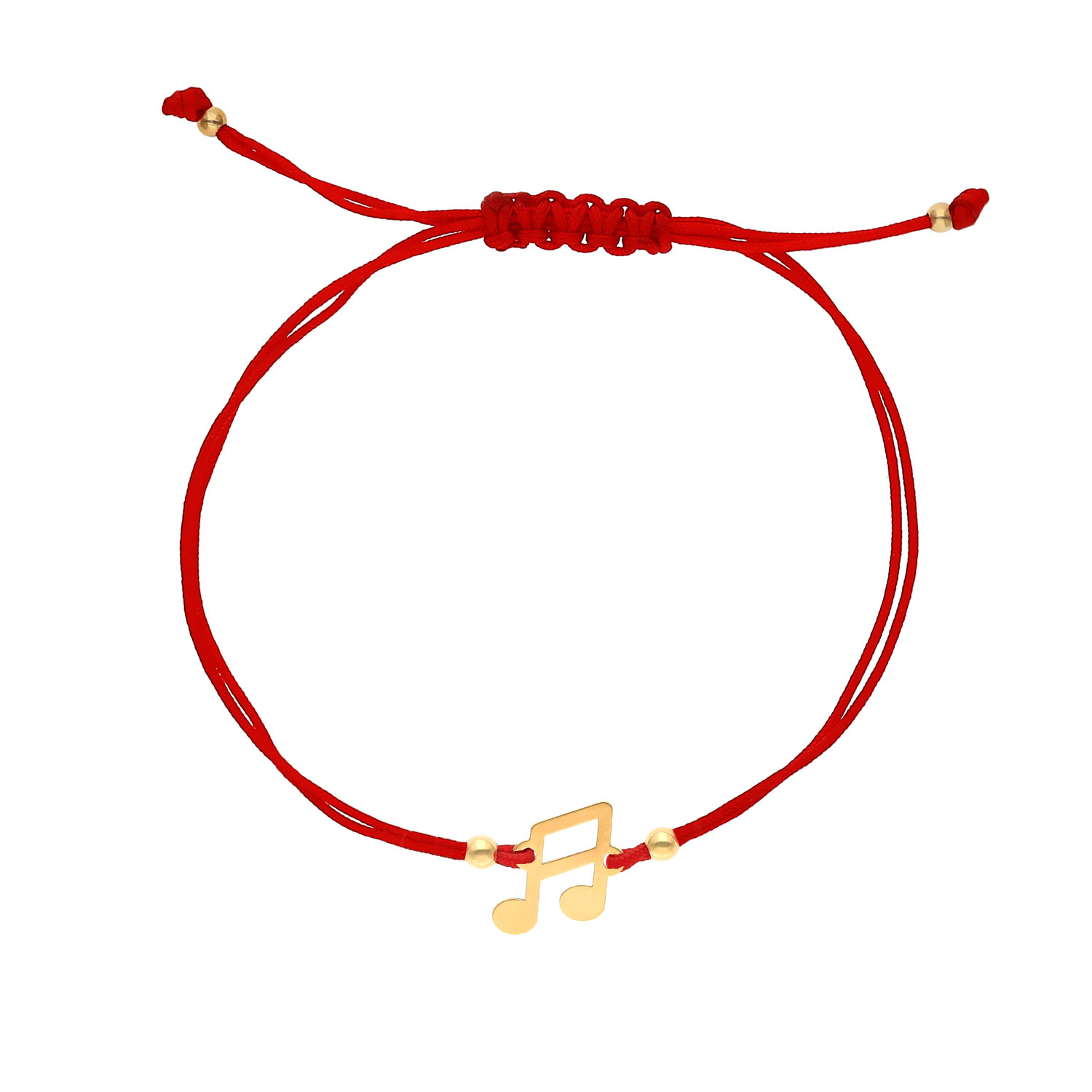 Armband an roter Kordel mit einem Anhänger in Form einer Musiknote. Hergestellt aus strapazierfähiger Kordel und 585er Sterling Gold (14 Karat). Durch Ziehen an den Knoten können Sie die Länge des Armbands so anpassen, dass es an Ihr Handgelenk passt. Dezentes, zartes Armband, das Ihrem Styling Charme verleiht.